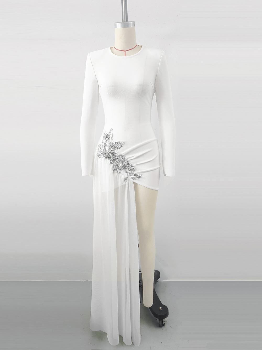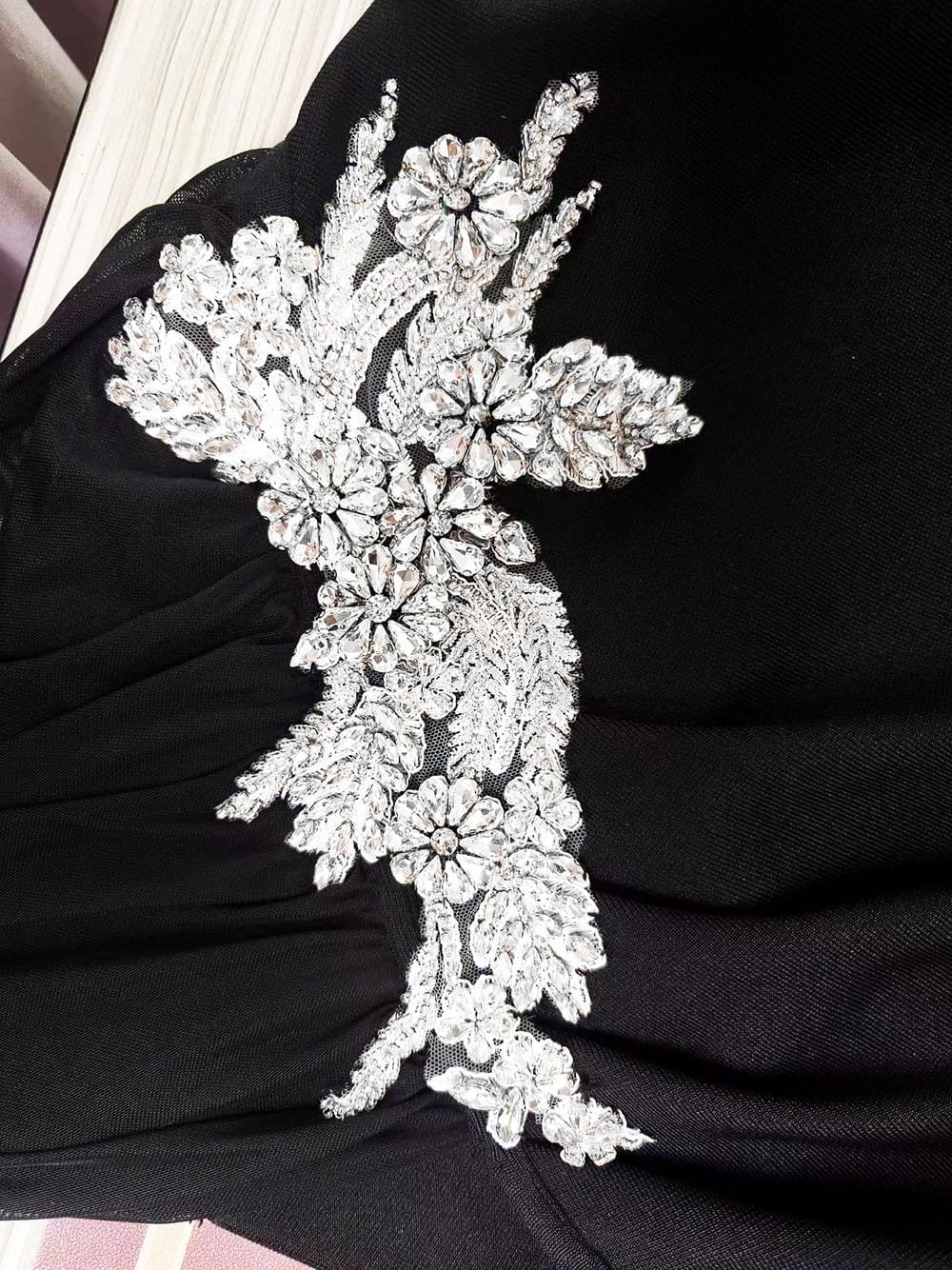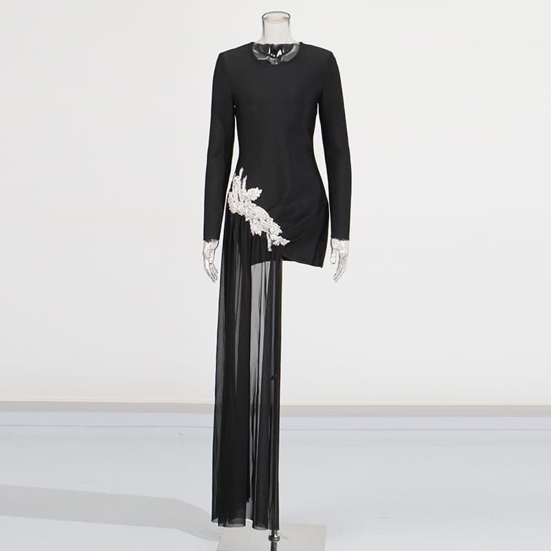 vestido bandage con manga larga y espectacular detalle de pedrería en un lateral desde el cual sale una gasa transparente del mismo color a modo decorativo, disponible negro y blanco