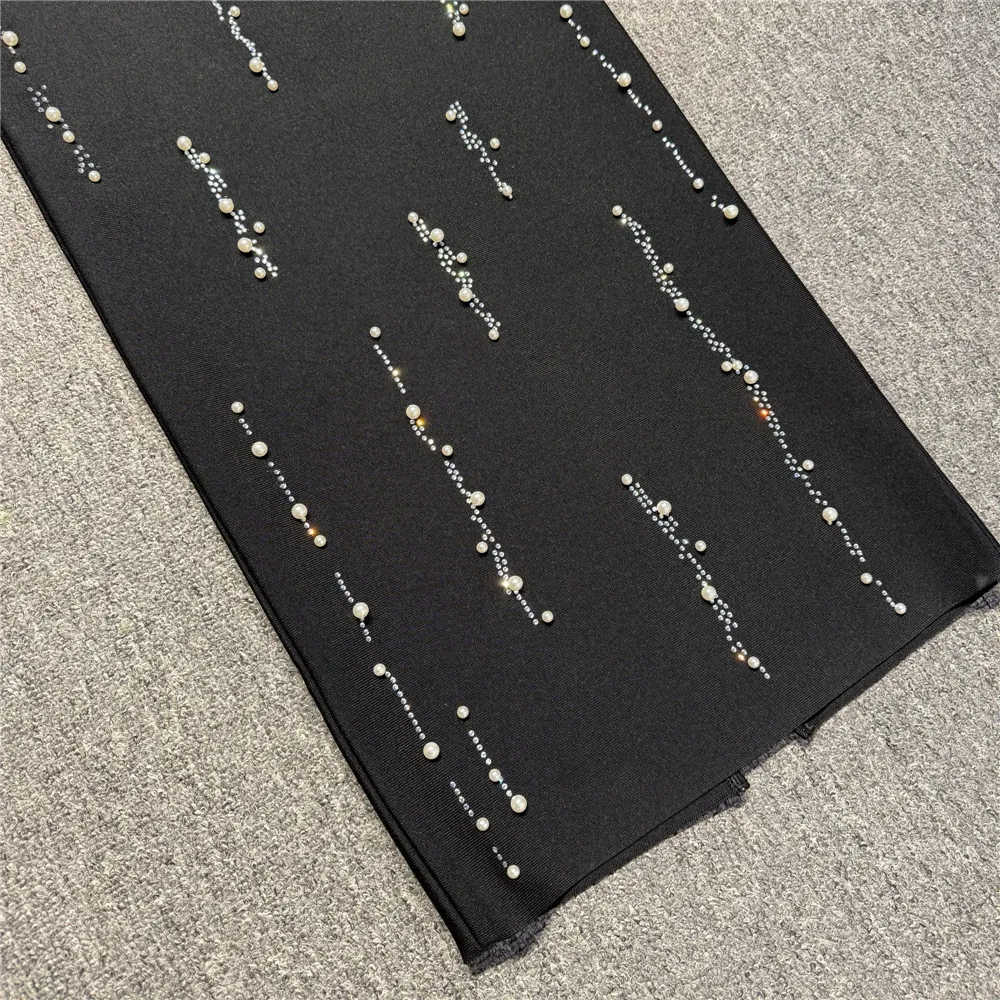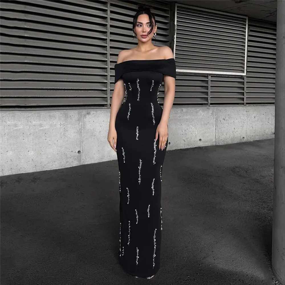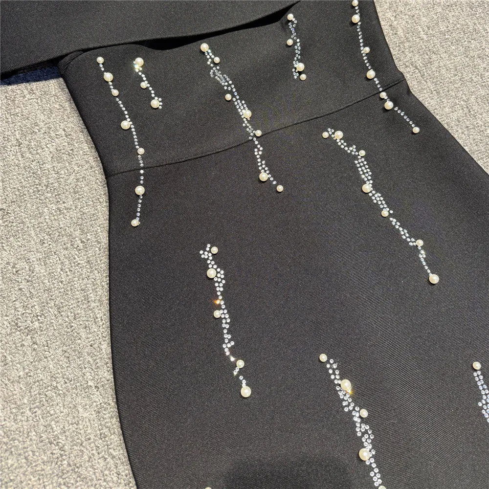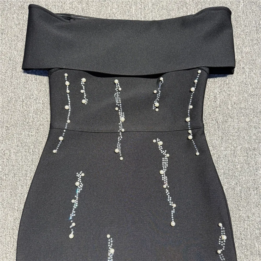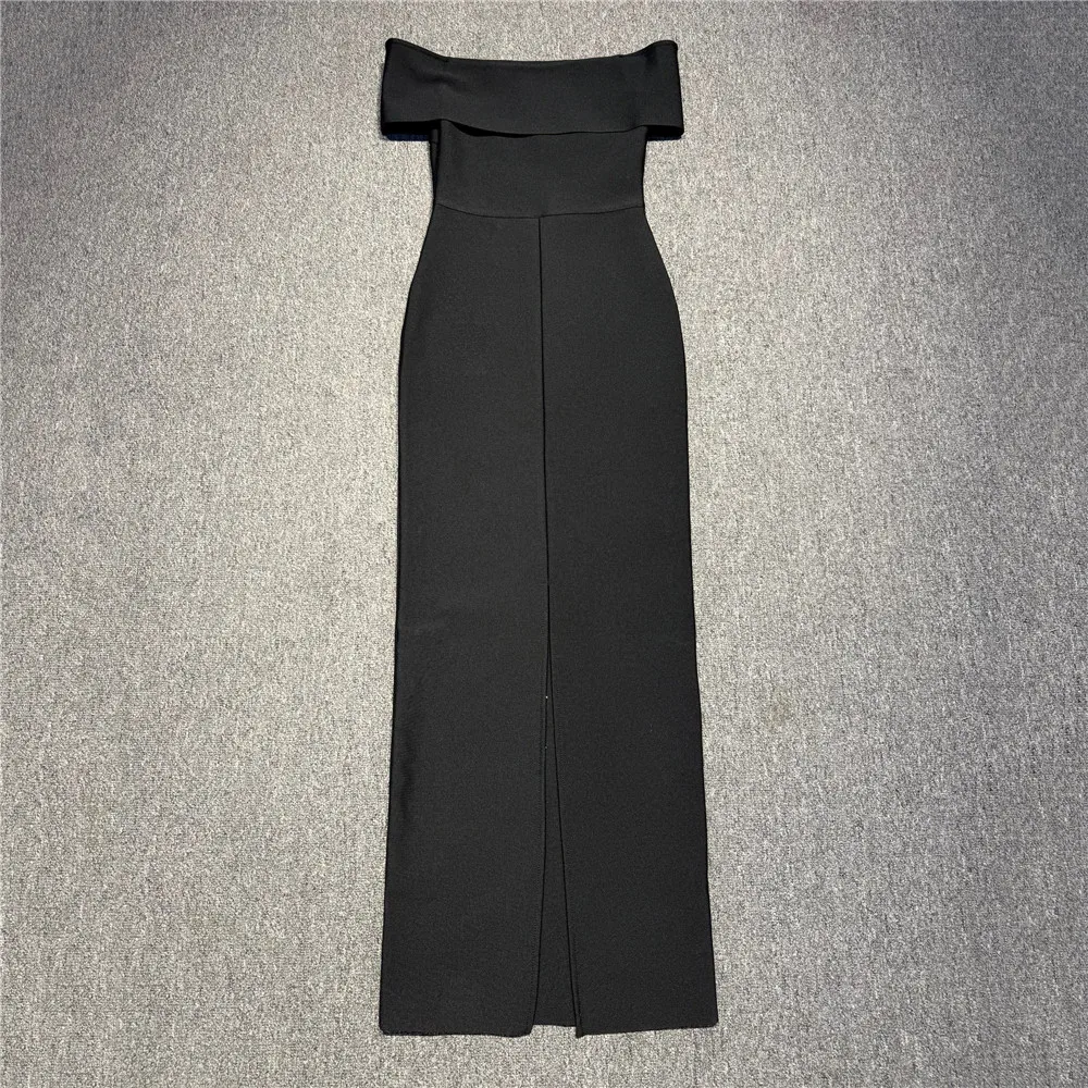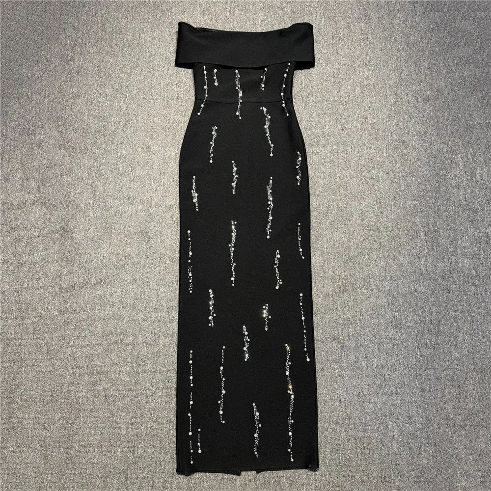 Deslumbra en tu próximo evento con este vestido largo negro bandage palabra de honor, diseñado para realzar la figura con un ajuste impecable y detalles de pedrería vertical que estilizan la silueta. Sofisticado, femenino y perfecto para galas, fiestas y noches especiales.