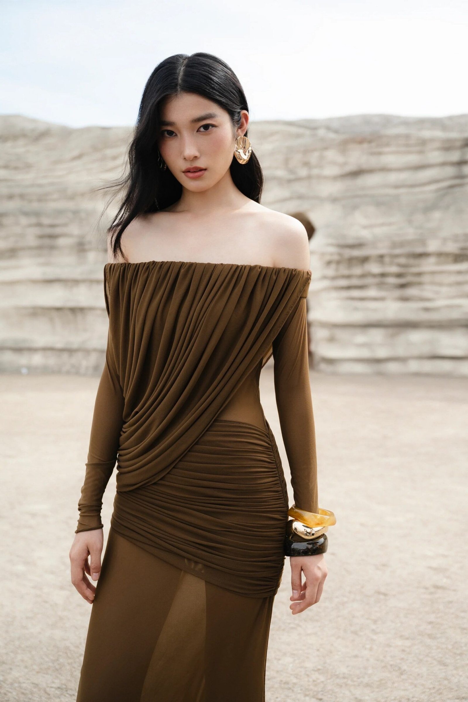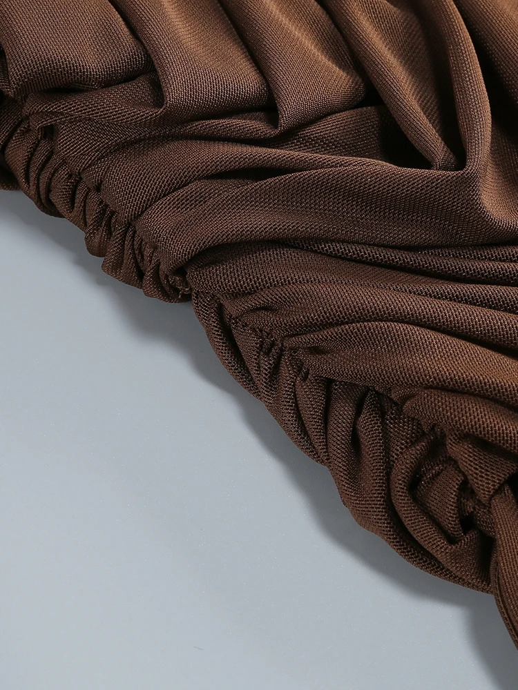 Este vestido largo marrón es una pieza de alto impacto que combina sensualidad, elegancia y diseño escultórico. Su escote palabra de honor deja los hombros al descubierto, aportando un aire sofisticado y femenino, mientras que el drapeado estratégico en el cuerpo moldea la silueta de forma favorecedora.
