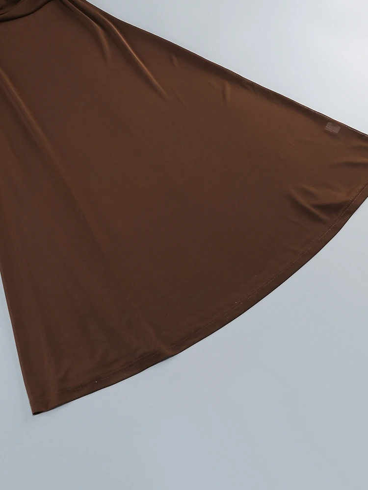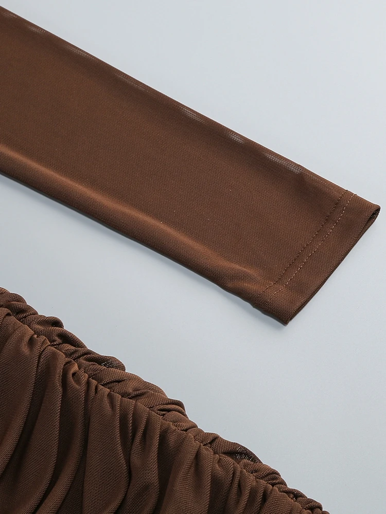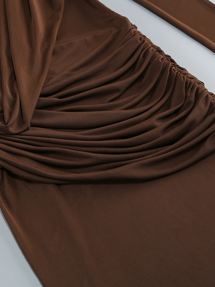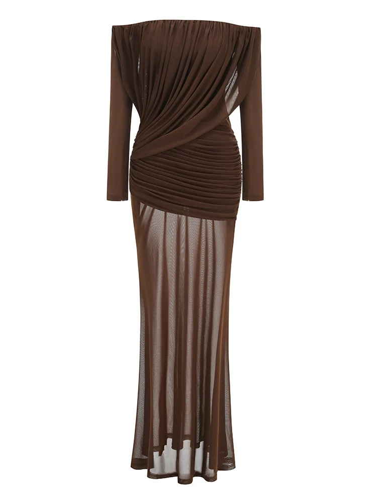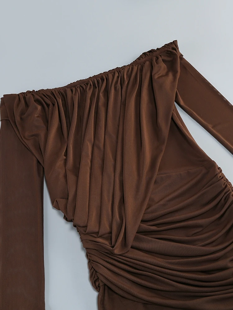 Descubre el vestido largo marrón palabra de honor con diseño drapeado, tejido fluido y ajuste elegante para eventos de noche y ocasiones especiales.