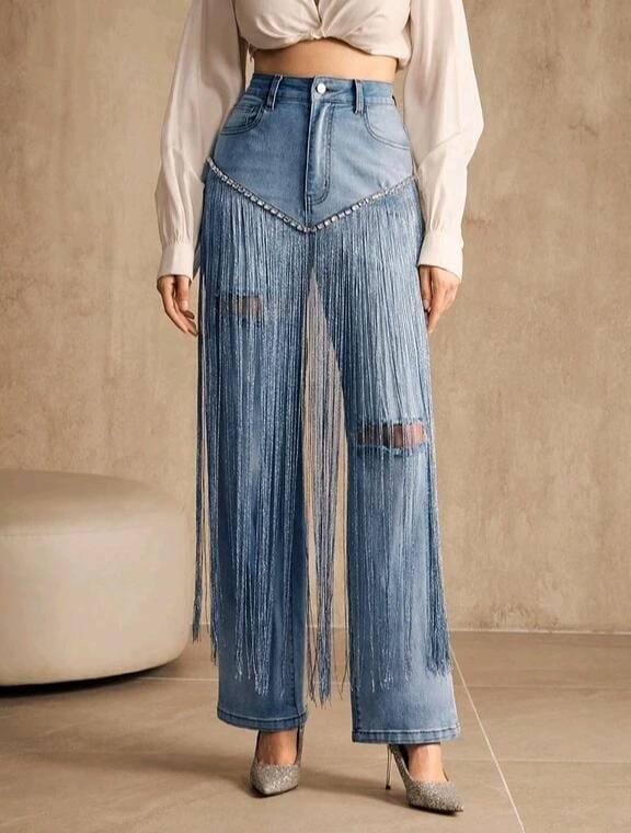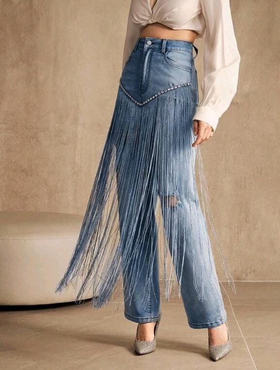 El protagonista absoluto es su detalle frontal de flecos largos en denim, integrados en forma de panel decorativo en la parte delantera, que añade un efecto visual elegante, original y muy llamativo. Un diseño perfecto para quienes buscan un look moderno, femenino y diferente, ideal tanto para eventos especiales como para estilismos urbanos con personalidad.