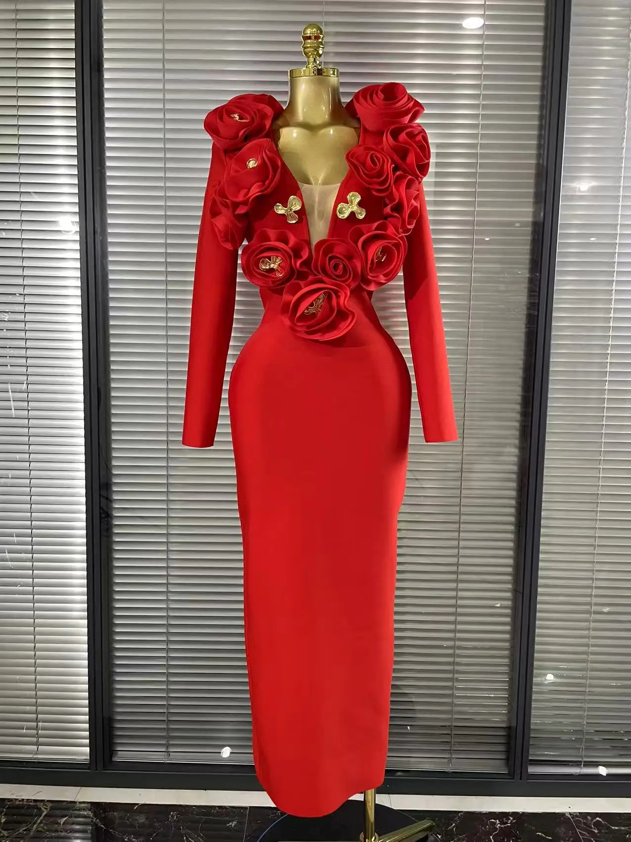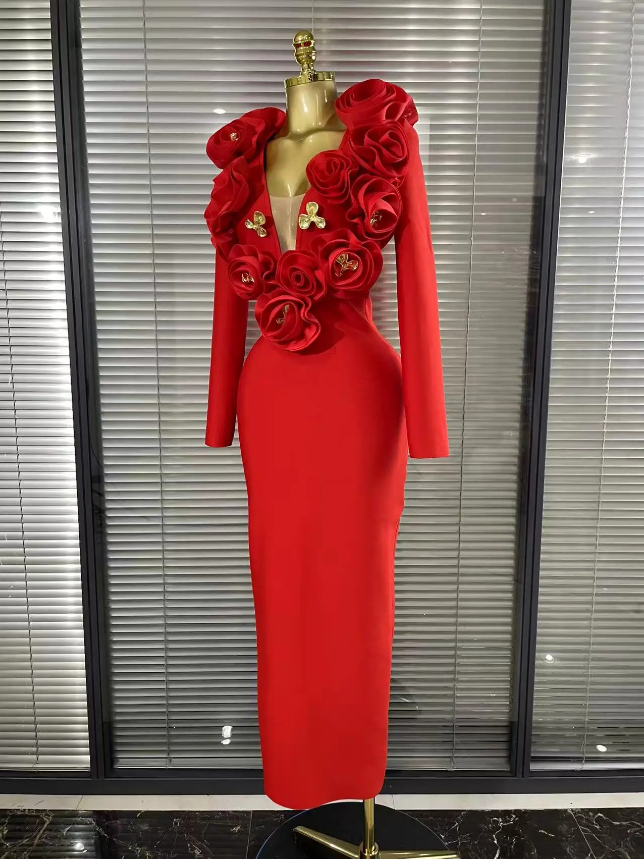 Impactante vestido BANDAGE rojo largo con diseño entallado, escote profundo y detalles de flores 3D. Ideal para galas, fiestas de lujo o eventos especiales donde quieras destacar con elegancia.