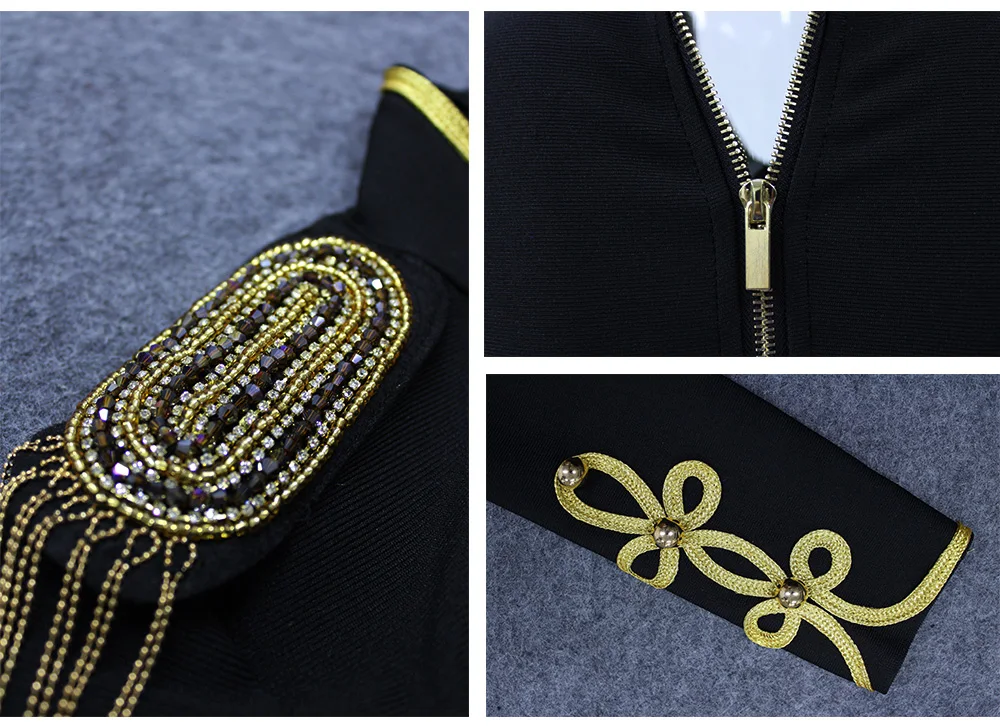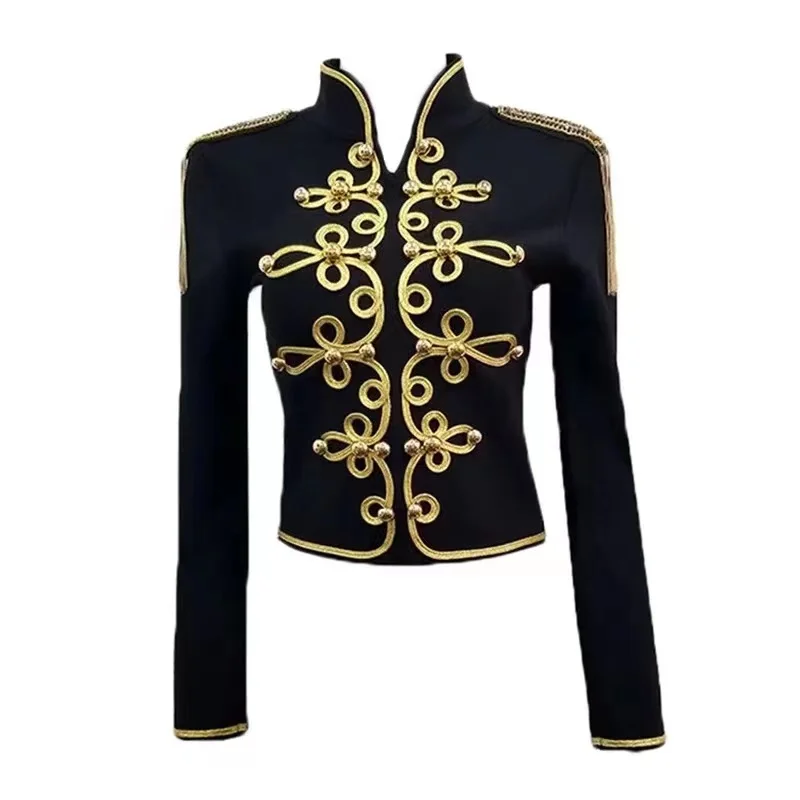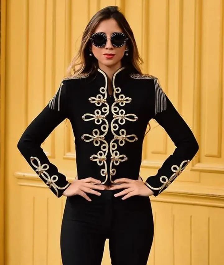 La chaqueta presenta un corte entallado que realza la silueta, con cuello mao y espectaculares bordados dorados en relieve en el frontal y mangas, inspirados en la sastrería de lujo. Los detalles de pasamanería dorada y flecos en los hombros aportan carácter, fuerza y un acabado premium.
