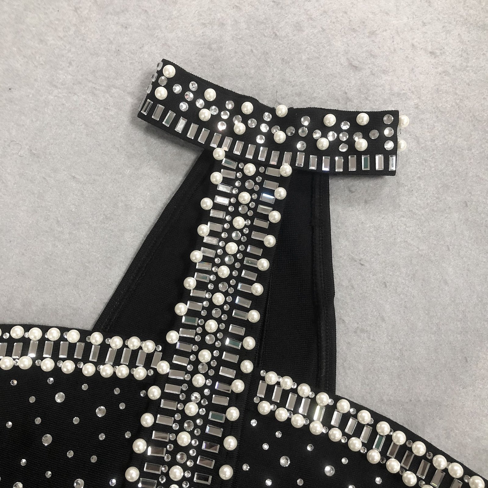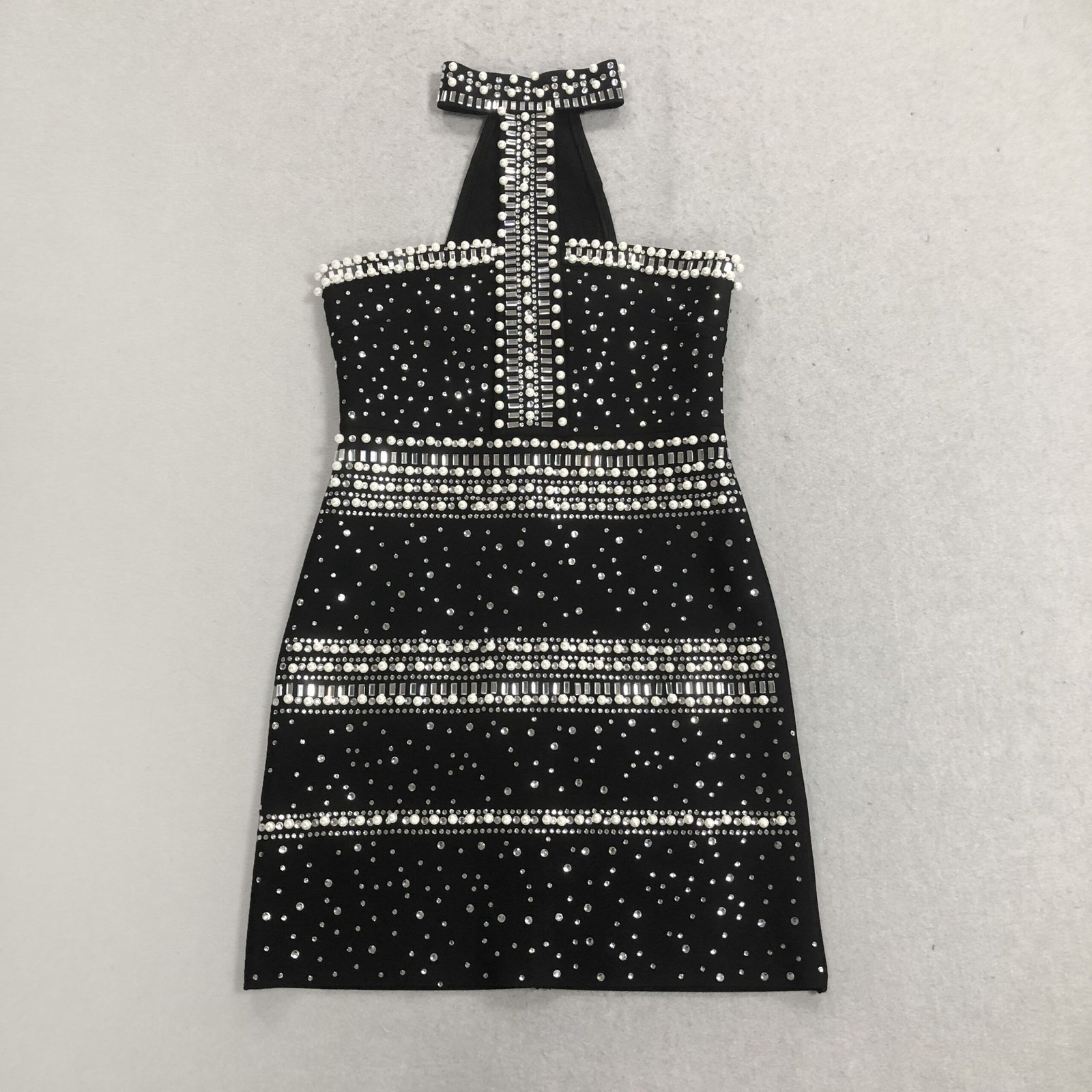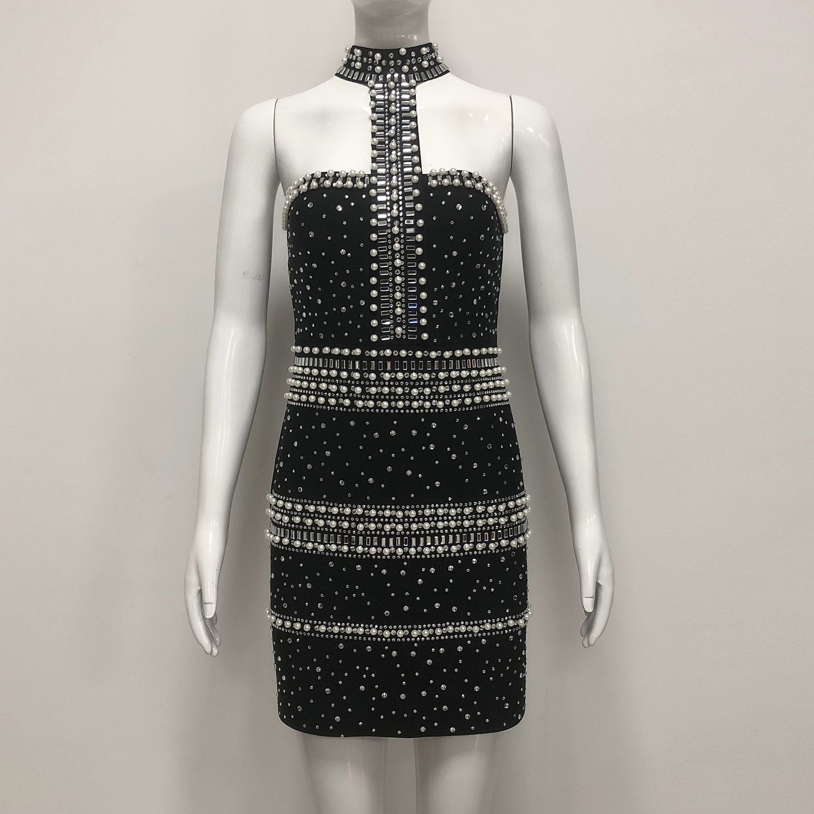 Vestido negro corto ajustado con escote halter, cuello alto decorado con pedrería y detalles de cristales en el frontal. Diseño elegante y femenino ideal para fiestas y eventos especiales.