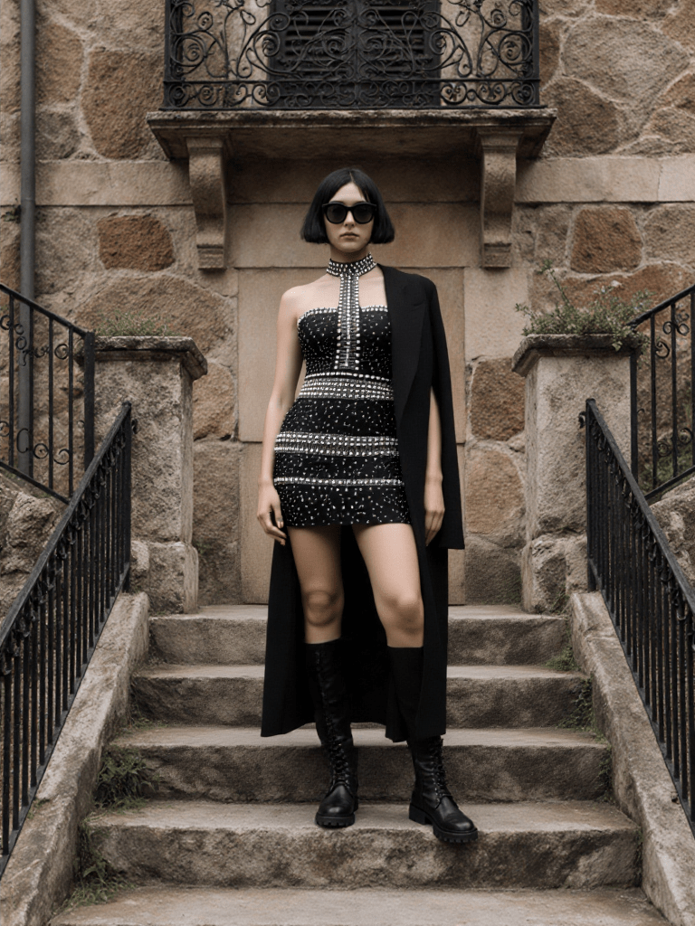 Sofisticado, sensual y con un marcado aire de fiesta, este vestido negro corto con pedrería es una pieza diseñada para destacar en eventos especiales. Confeccionado en tejido de alta calidad y estructura firme, se ajusta perfectamente al cuerpo, realzando la silueta de forma elegante y favorecedora.