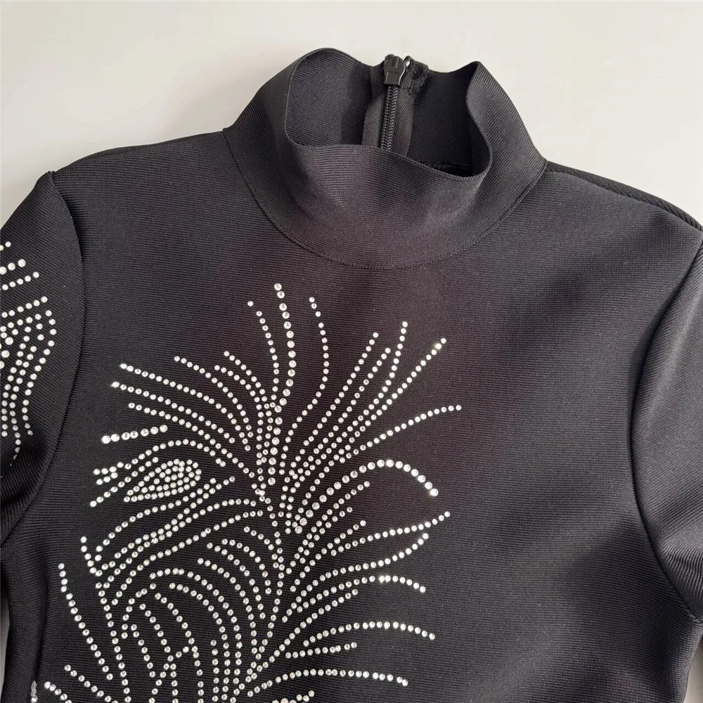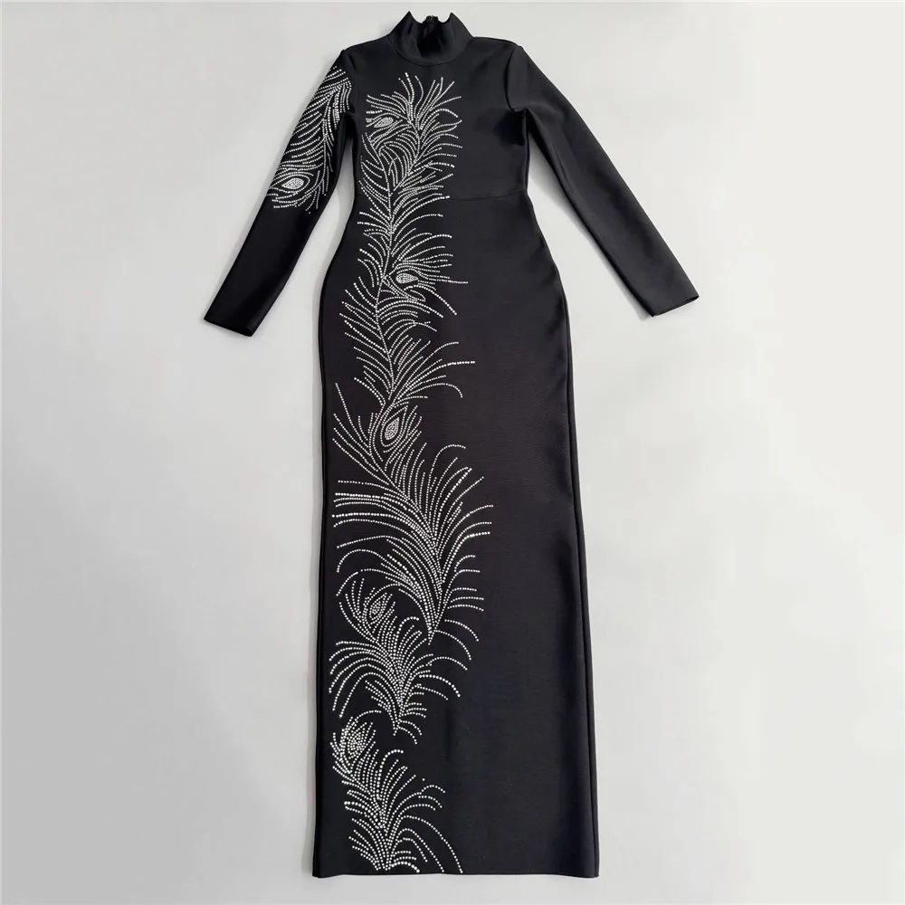 El cuello alto y las mangas largas aportan un toque refinado, ideal para eventos formales y noches elegantes. Su corte recto y largo completo transmite sofisticación absoluta, equilibrando perfectamente el brillo de los cristales con una base negra elegante y minimalista.