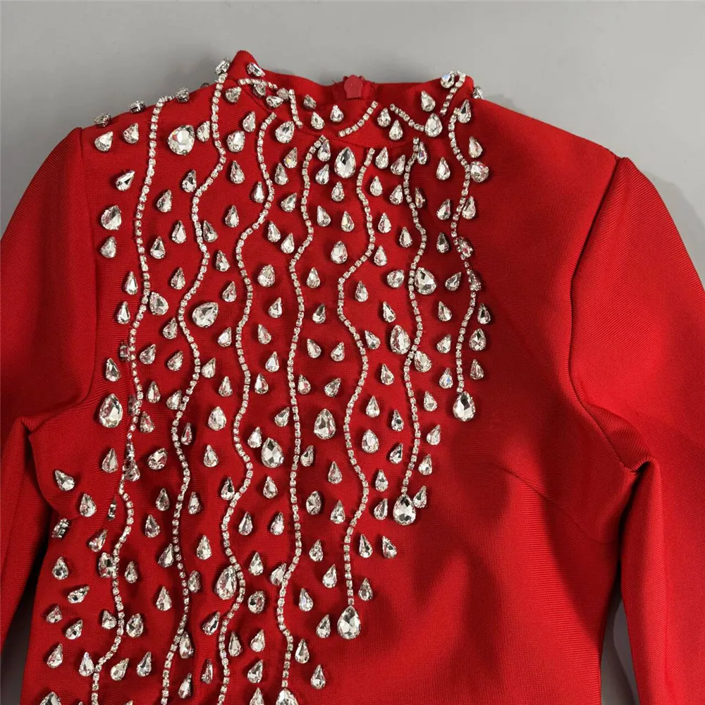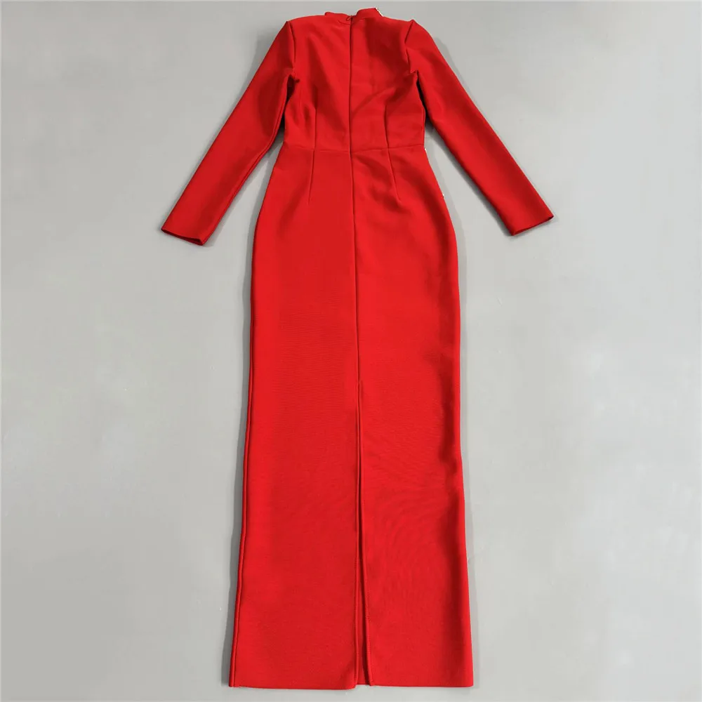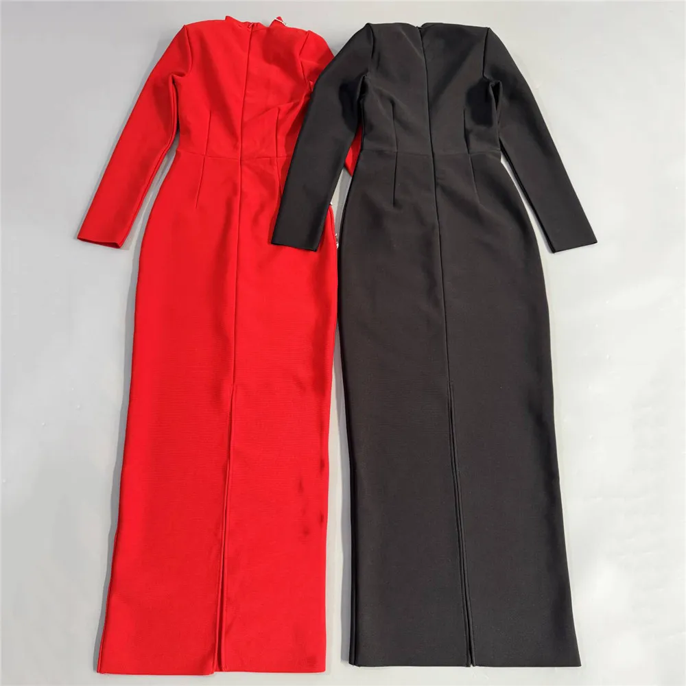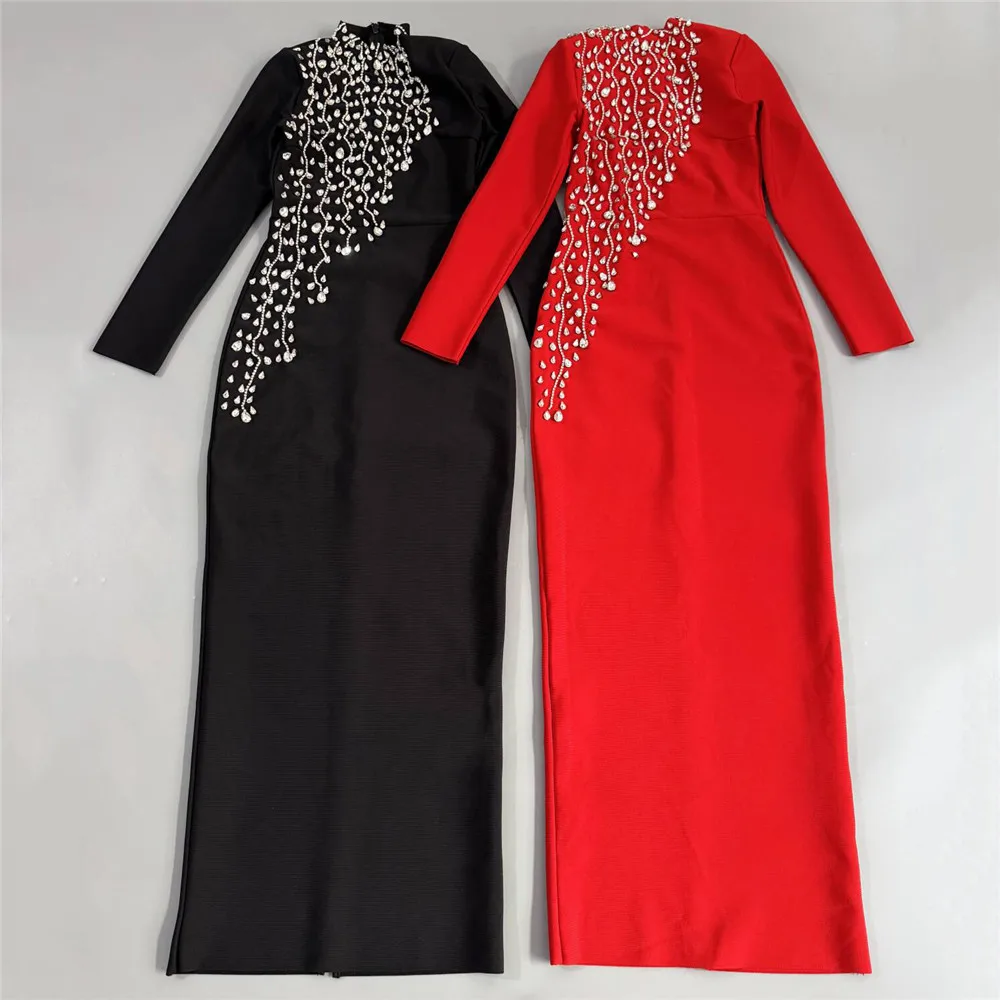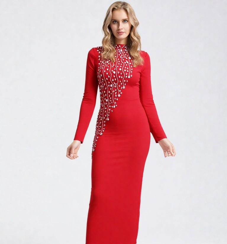 Vestido bandage midi de manga larga disponible en rojo y negro. Diseño elegante con detalle frontal de pedrería que estiliza y realza la figura. Tejido ceñido de alta sujeción ideal para eventos y fiestas especiales