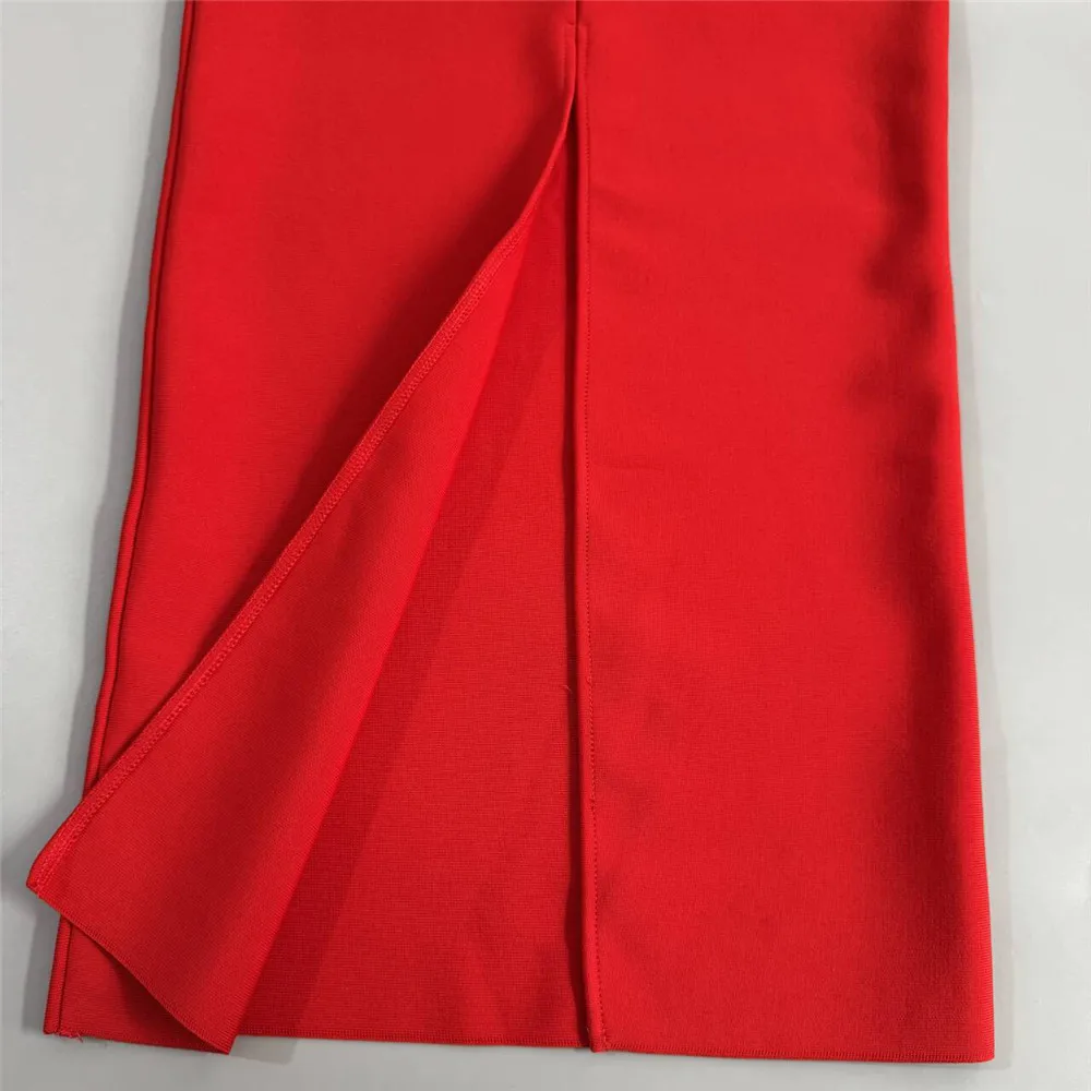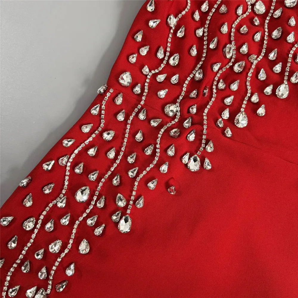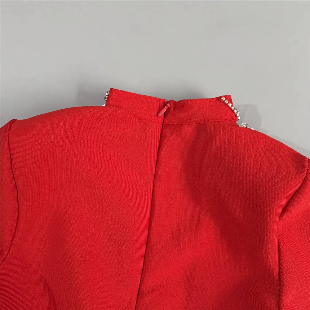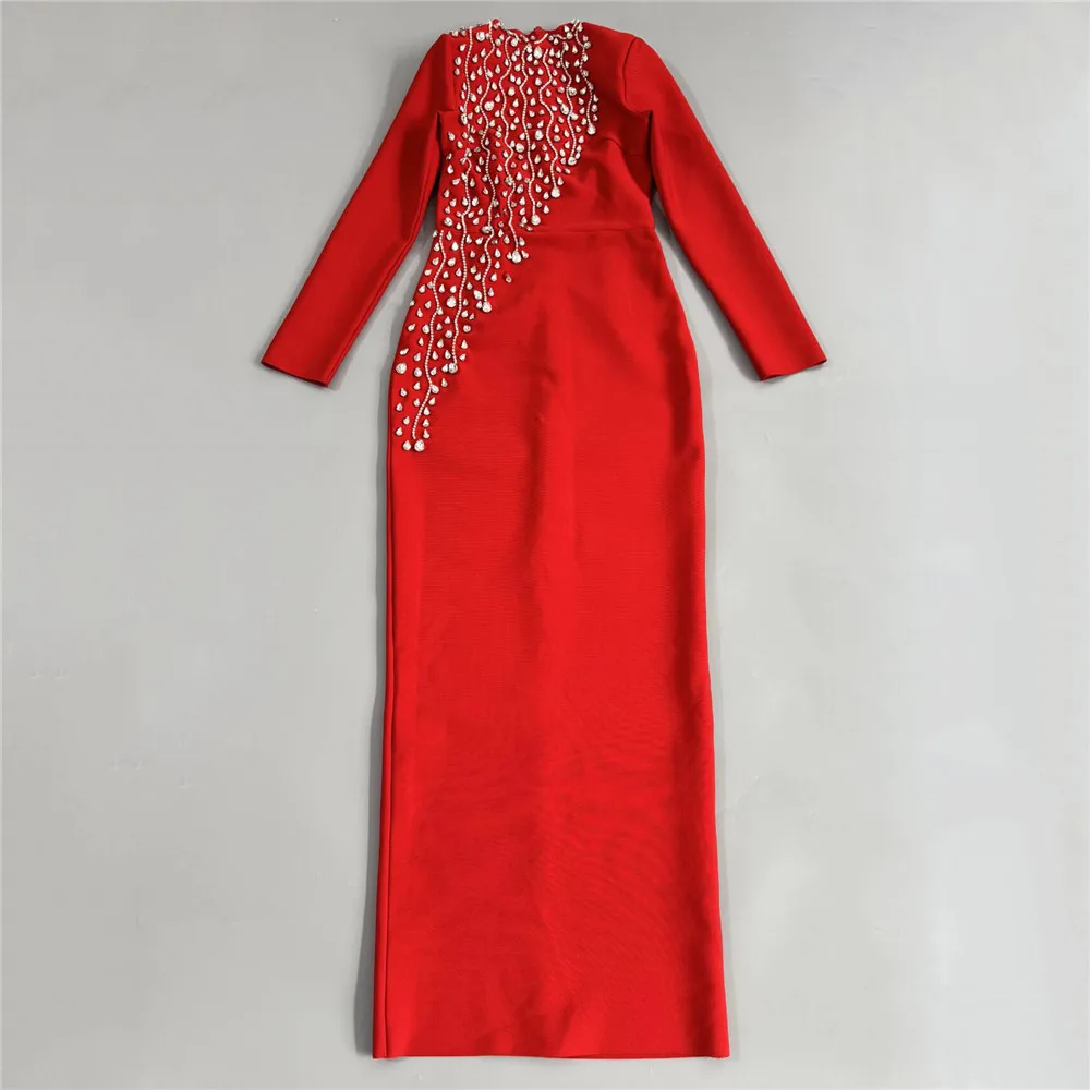 Vestido bandage midi de manga larga disponible en rojo y negro. Diseño elegante con detalle frontal de pedrería que estiliza y realza la figura. Tejido ceñido de alta sujeción ideal para eventos y fiestas especiales