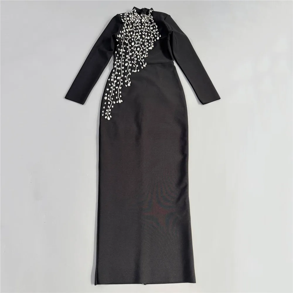El escote cerrado y la manga larga aportan un toque distinguido, mientras que el protagonismo recae en el panel frontal de pedrería premium, formado por cristales estratégicamente colocados que crean un efecto visual único. Este diseño estiliza el torso, define la cintura y añade un acabado brillante perfecto para eventos especiales.