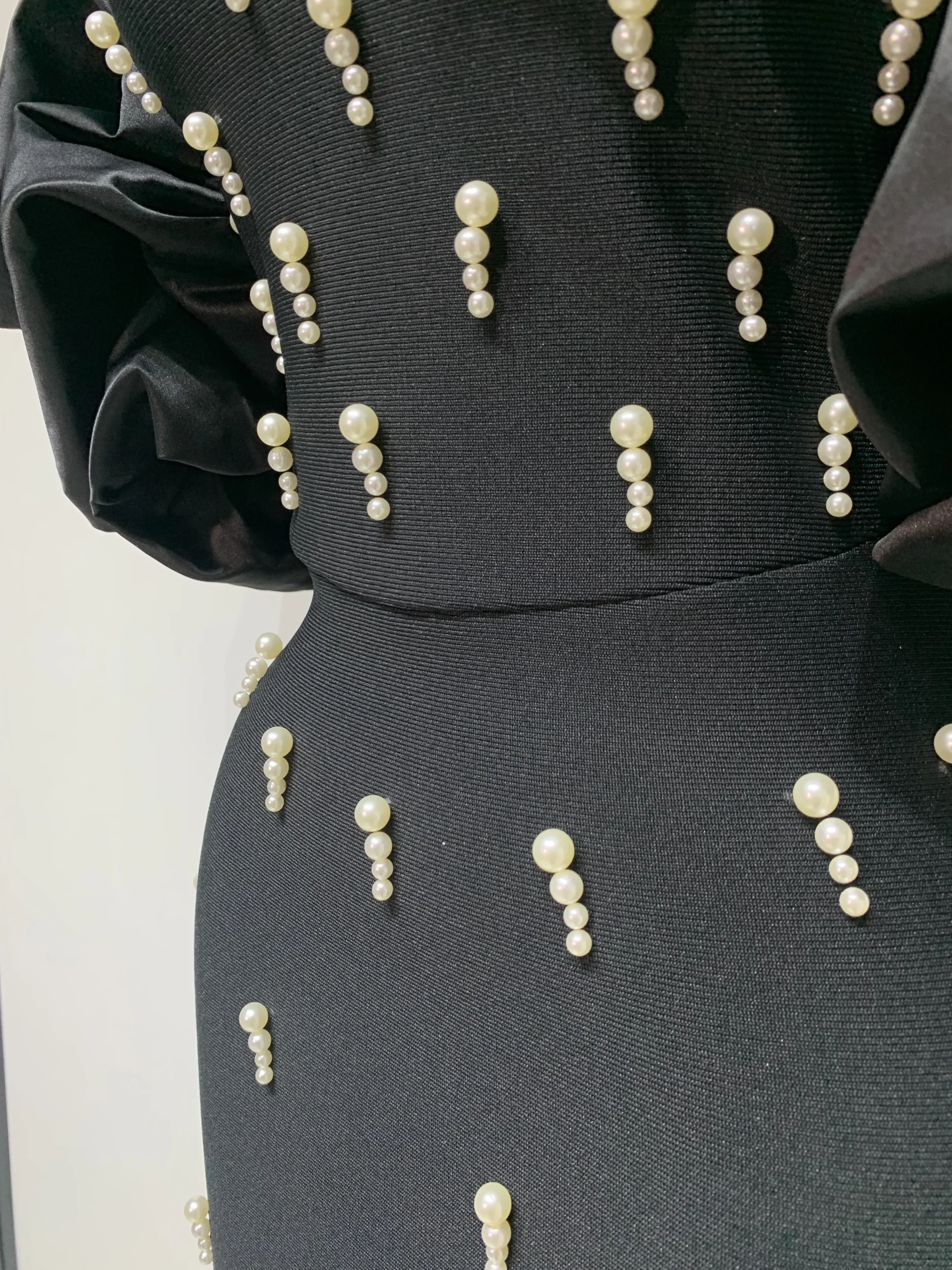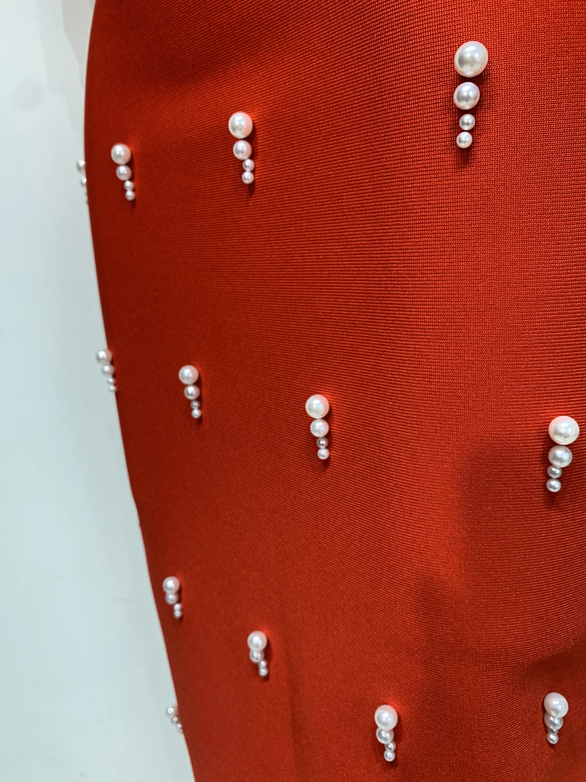 El tejido bandage está decorado con aplicaciones verticales de perlas brillantes, distribuidas estratégicamente para estilizar visualmente y aportar la cantidad perfecta de brillo sin exceso. La falda midi, de corte recto y ceñido, alarga la figura y ofrece un look sofisticado, ideal tanto para noche como para eventos formales.