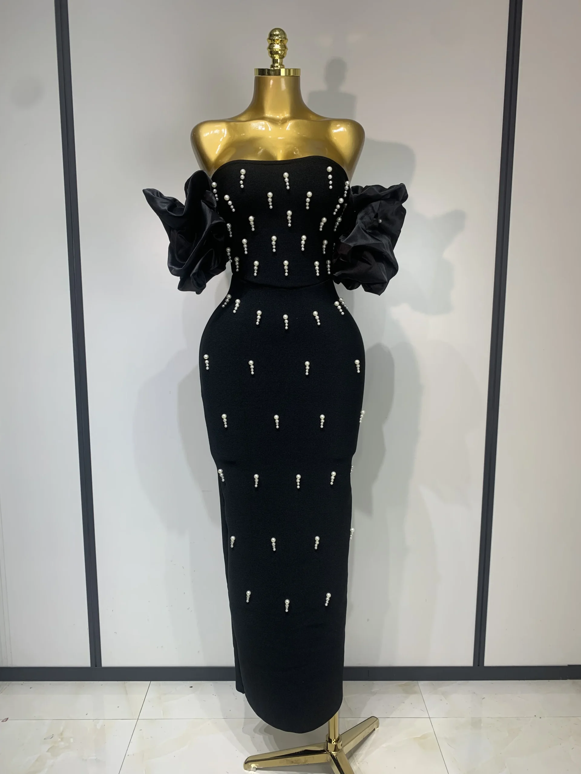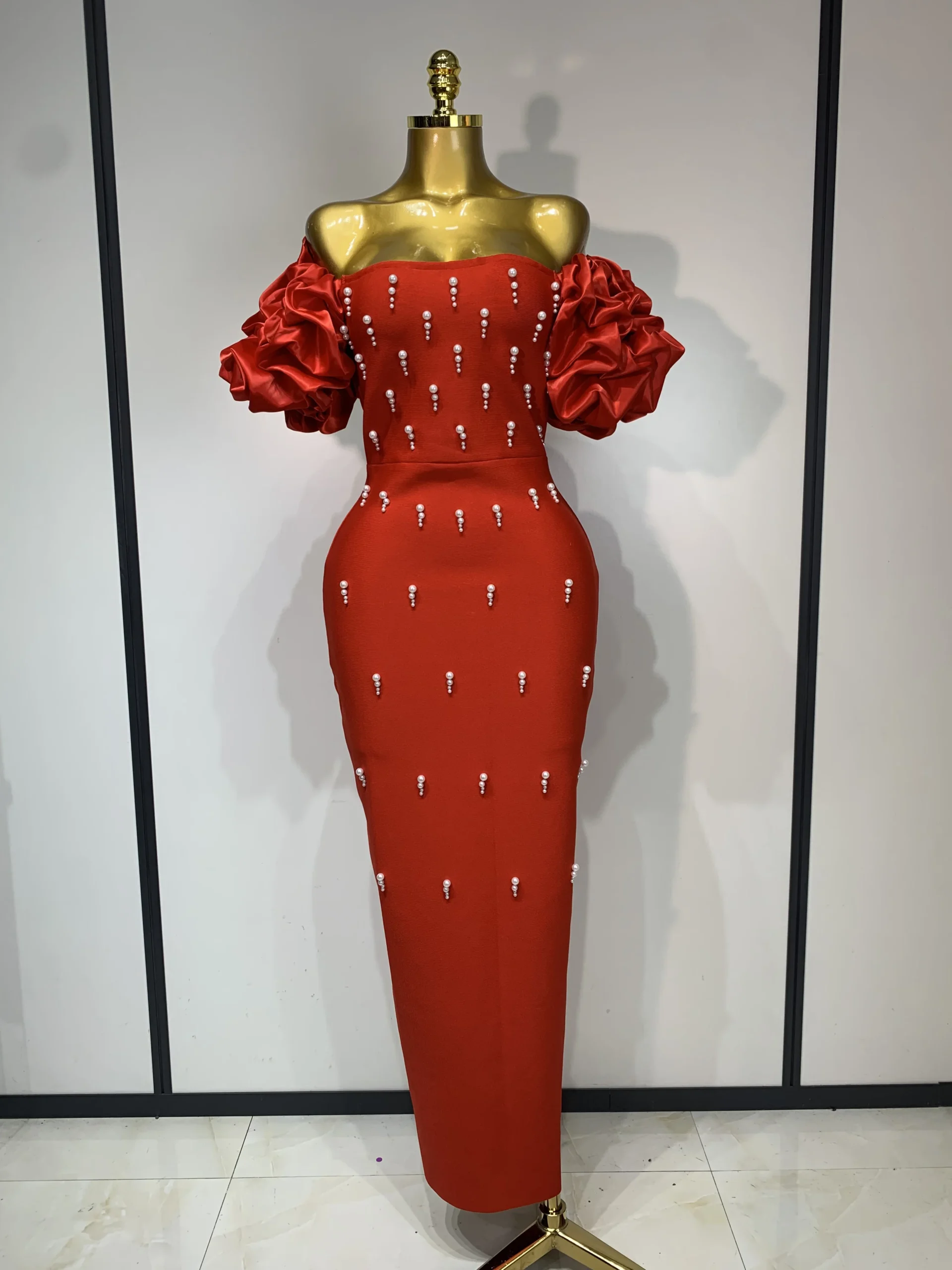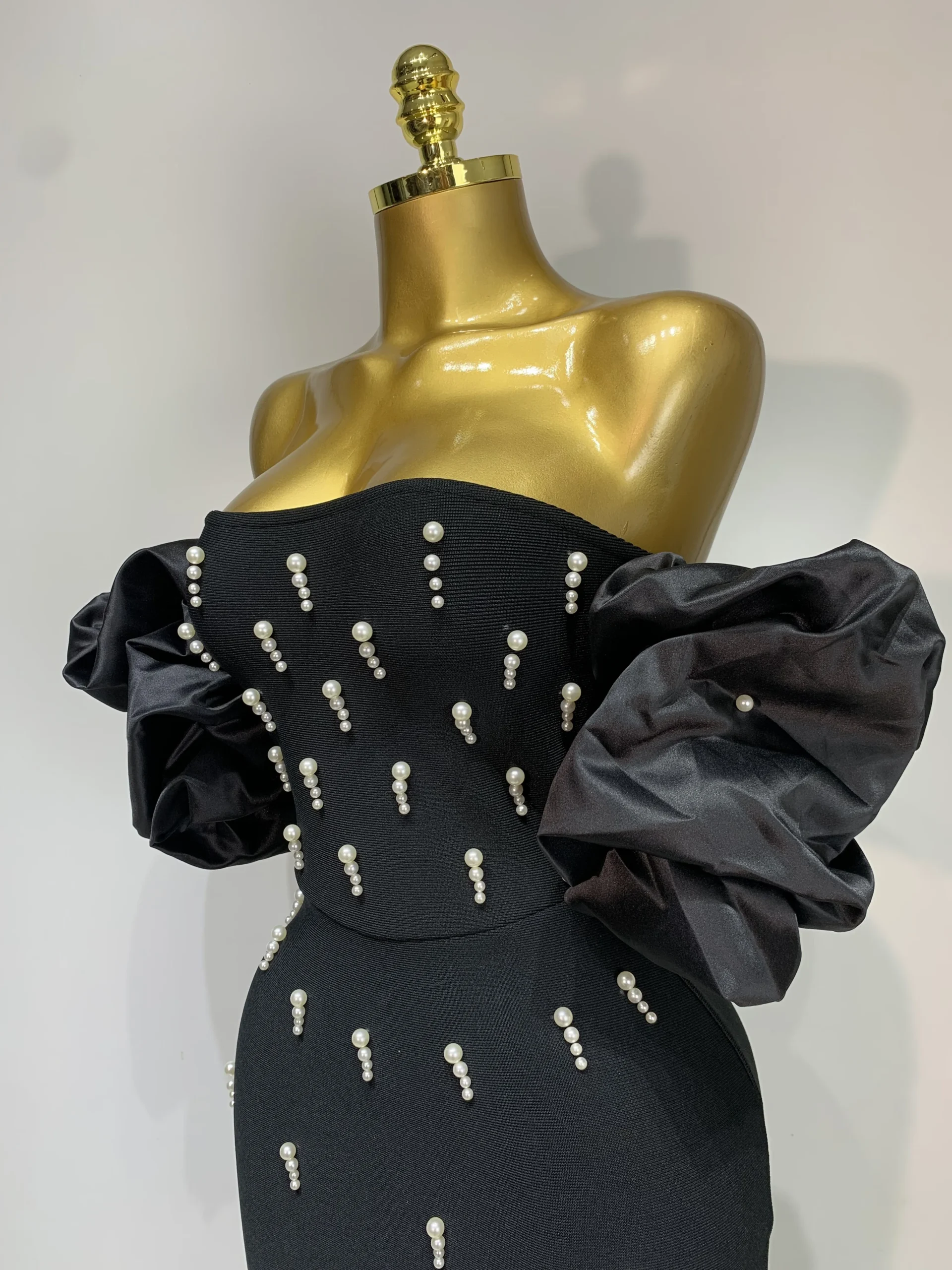 El vestido presenta un escote palabra de honor caído (off shoulder) que deja los hombros al descubierto de forma femenina y elegante. El punto focal del diseño son sus mangas abullonadas de satén, elaboradas con gran volumen para crear un contraste espectacular con la silueta ajustada del cuerpo. Estas mangas añaden lujo, dramatismo y un toque de alta costura.