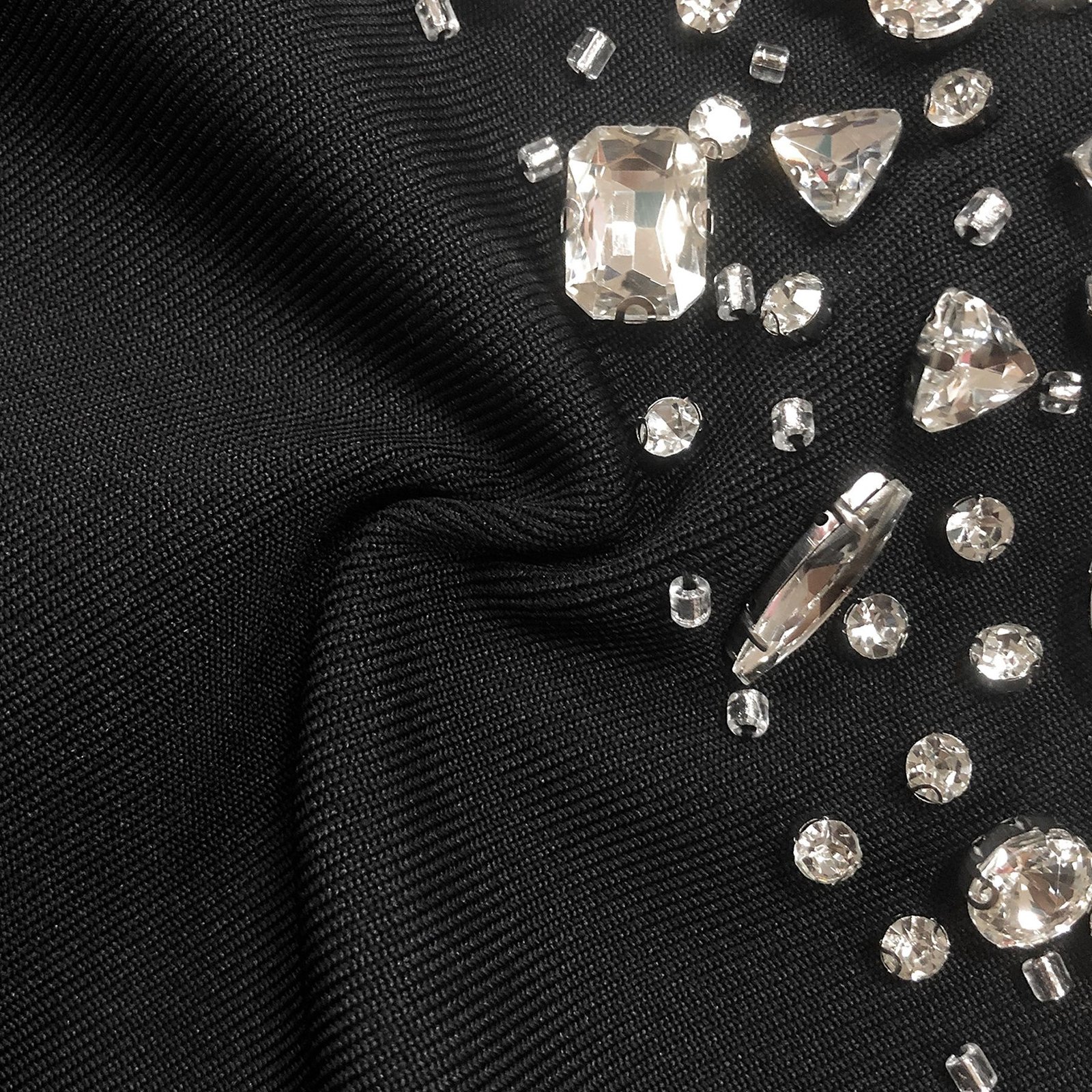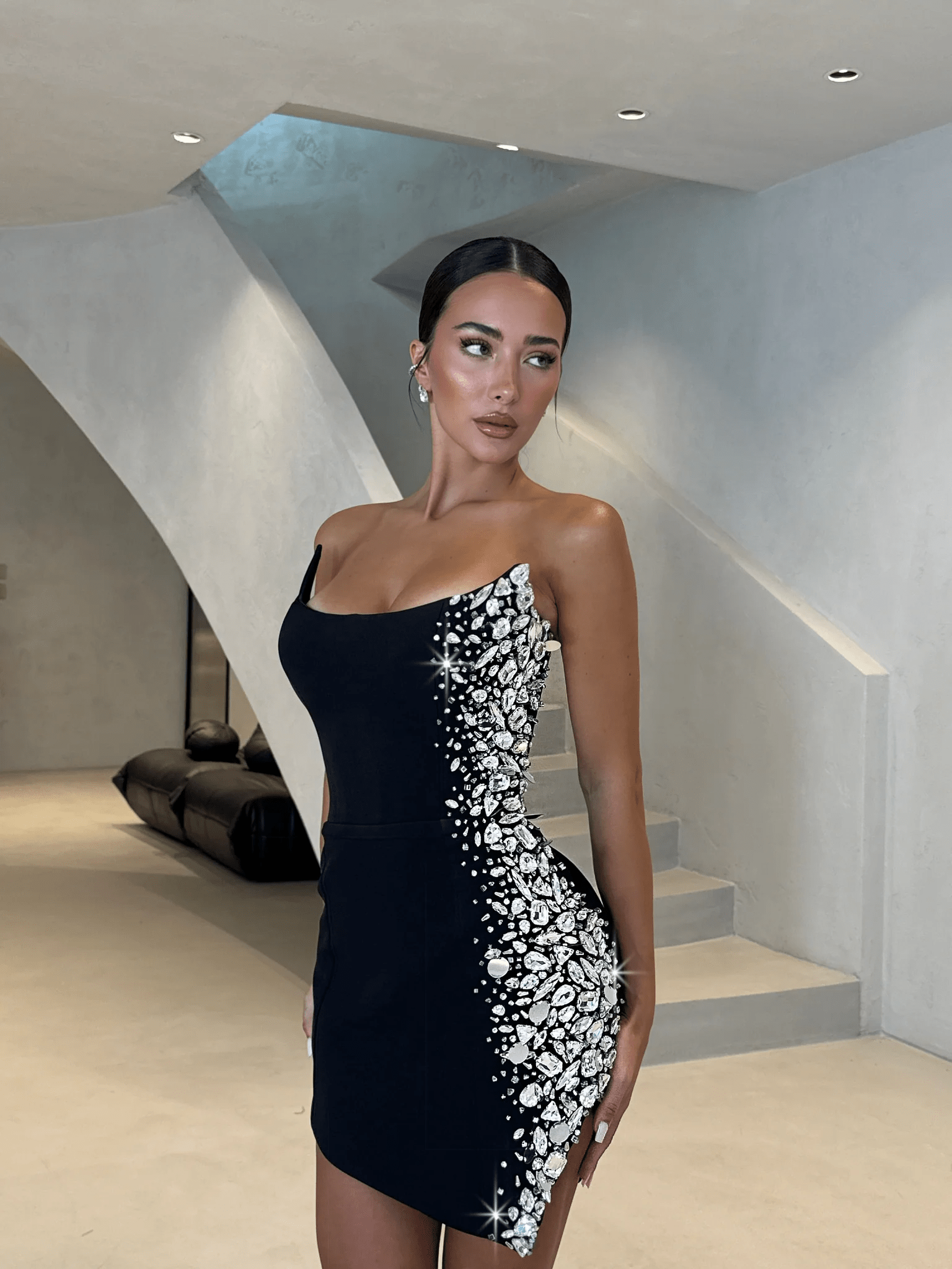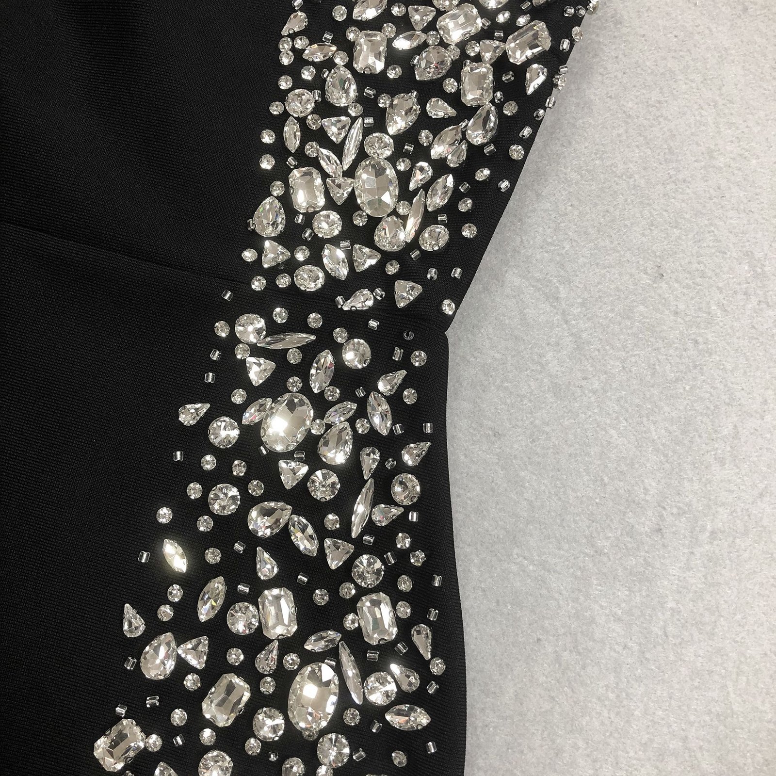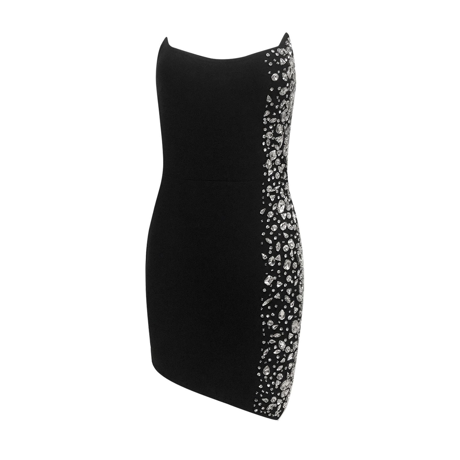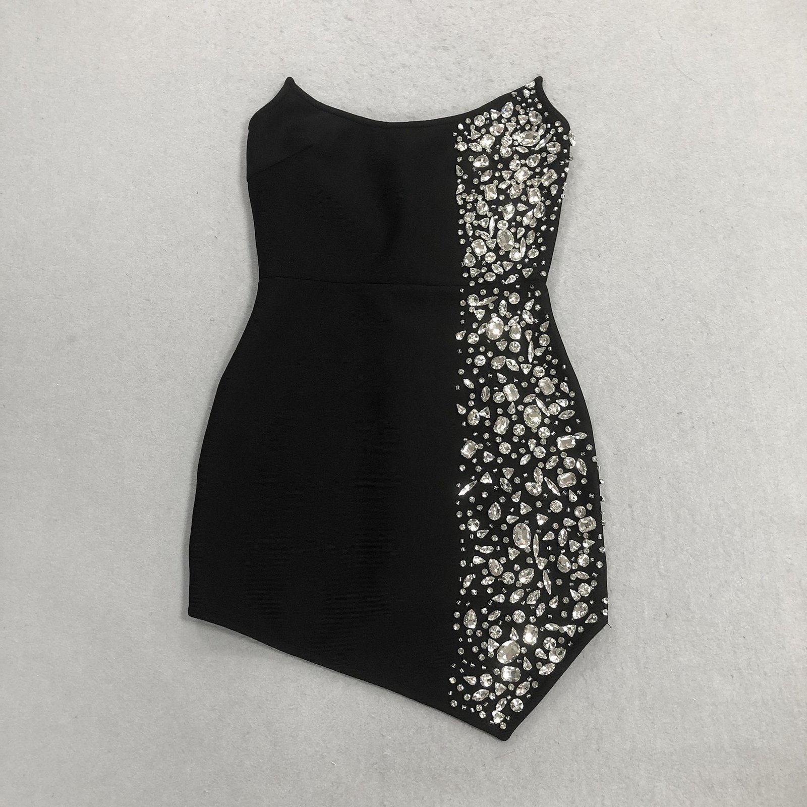 Vestido negro de fiesta con espectacular pedrería lateral en cristales de alta calidad. Diseño ajustado, escote asimétrico y tejido elástico que moldea la figura. Elegante, sofisticado y perfecto para eventos, noches especiales y celebraciones exclusivas.