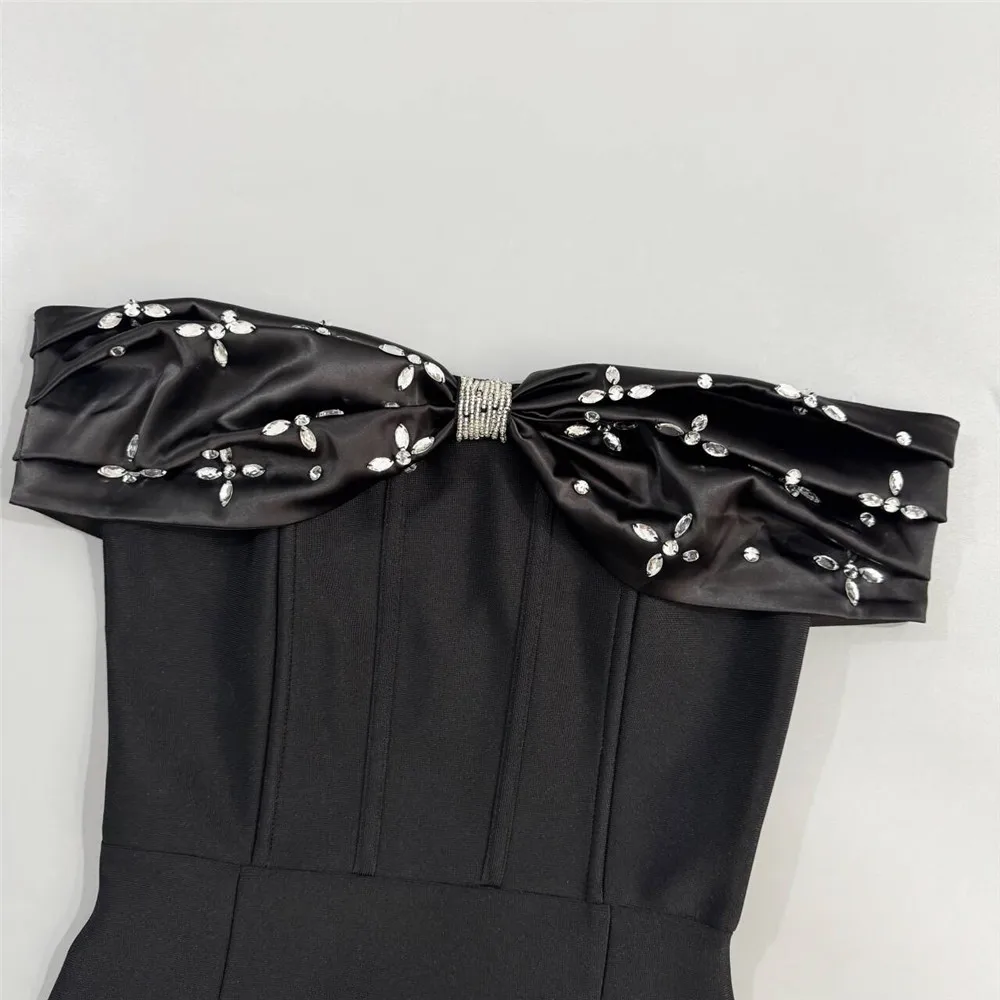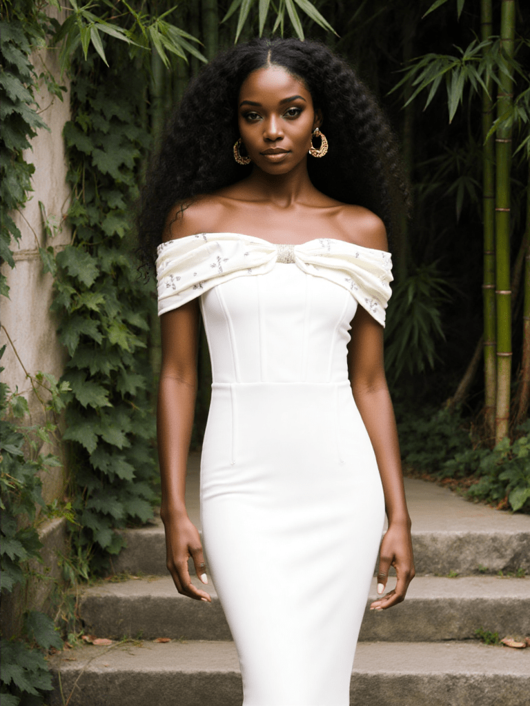 El escote bardot incorpora un lazo estructurado decorado con bordados delicados y pedrería brillante, que aporta un toque de glamour sin perder la clase. El detalle central adornado realza el diseño y atrae la mirada hacia el rostro y los hombros.