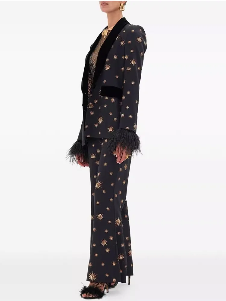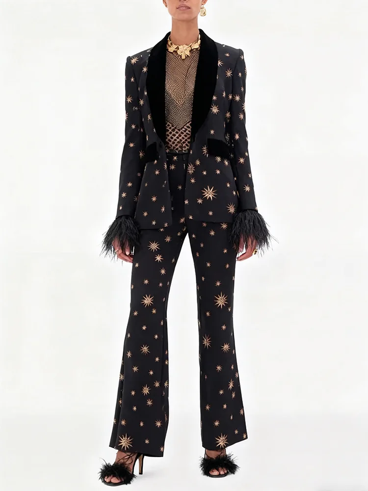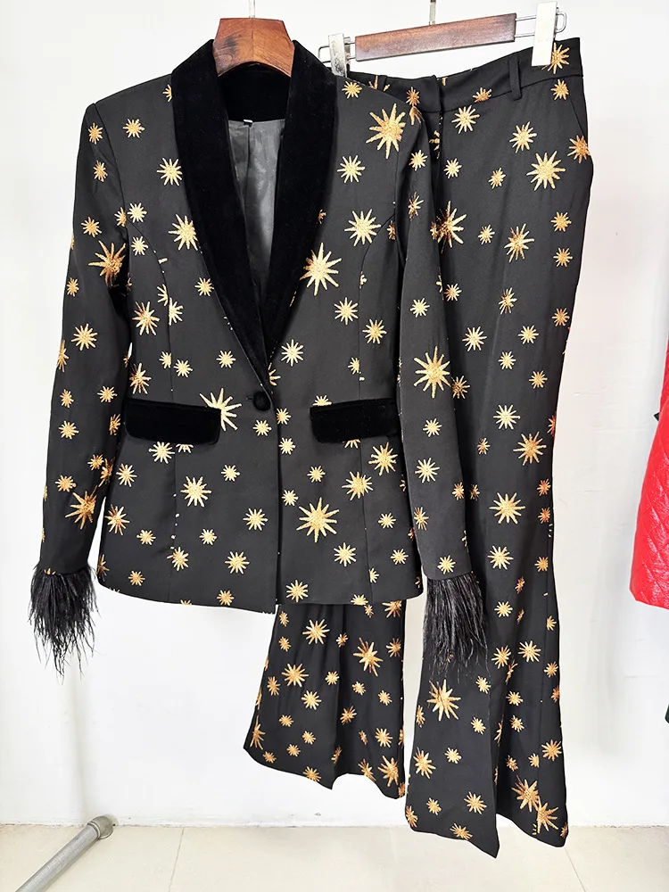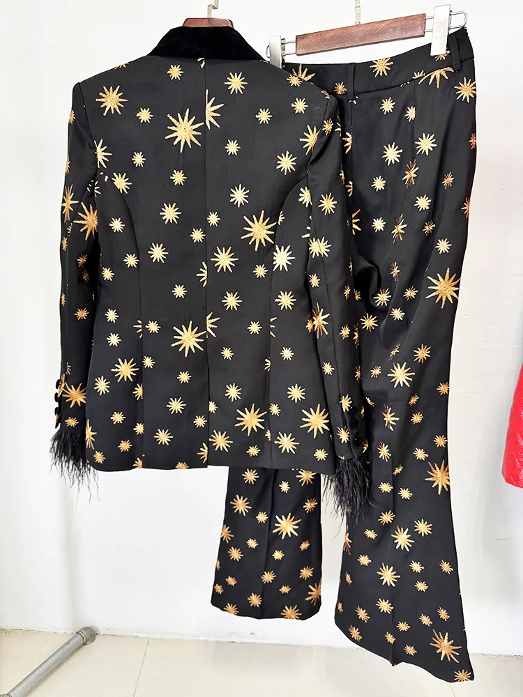 Conjunto elegante compuesto por chaqueta negra con solapas de terciopelo, estampado de estrellas doradas y puños con plumas, y pantalón de corte acampanado a juego. Diseño sofisticado y de alto impacto ideal para eventos, fiestas y ocasiones especiales.