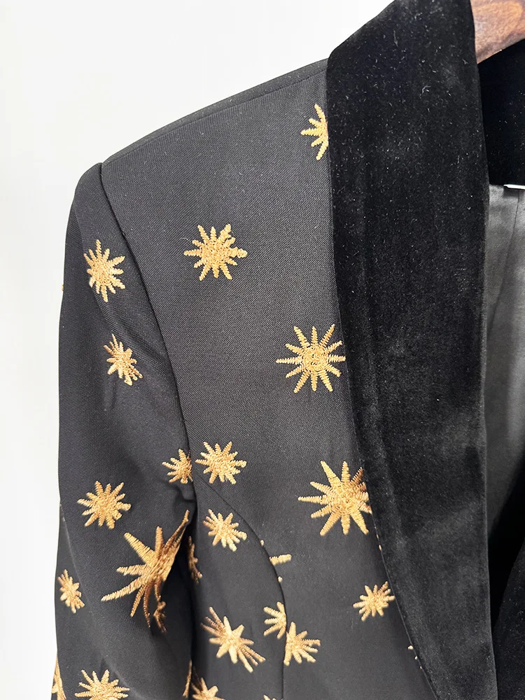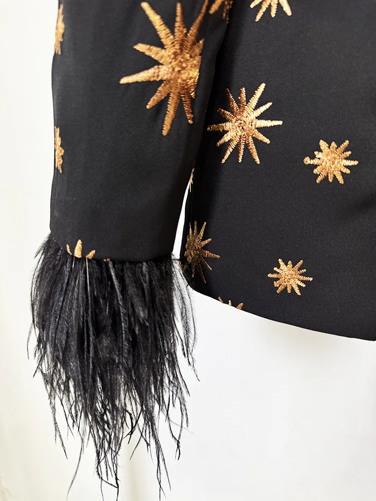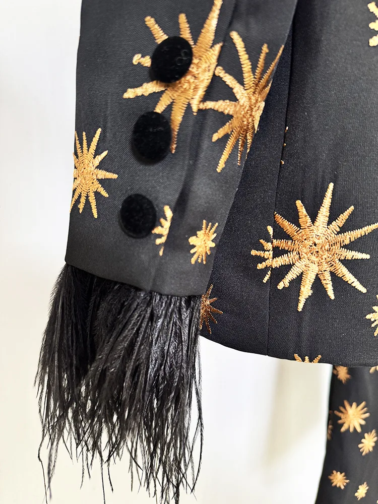 La chaqueta presenta un diseño exquisito con solapas en terciopelo negro, cierre frontal clásico y un espectacular detalle de plumas en los puños, que aporta movimiento, lujo y un acabado de pasarela. El estampado de estrellas doradas, distribuido de forma equilibrada por toda la prenda, añade brillo y un carácter exclusivo sin perder sofisticación.