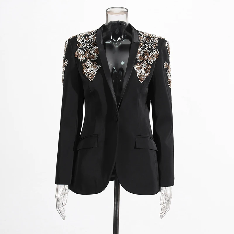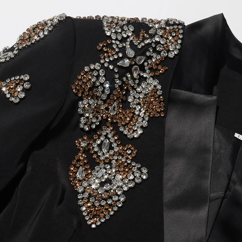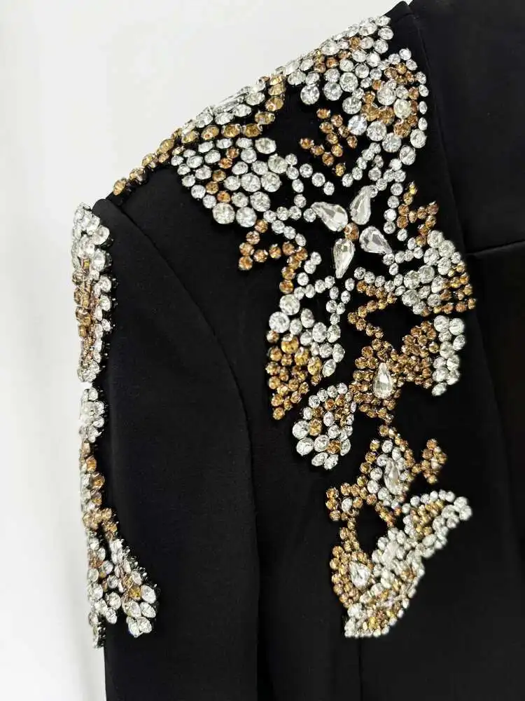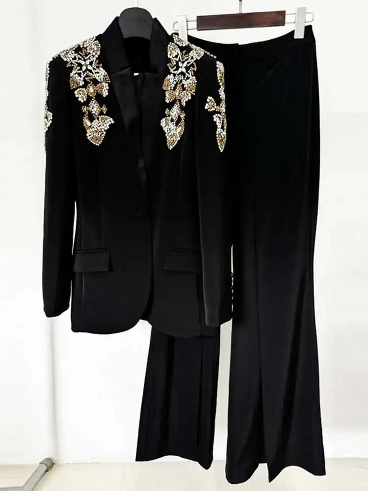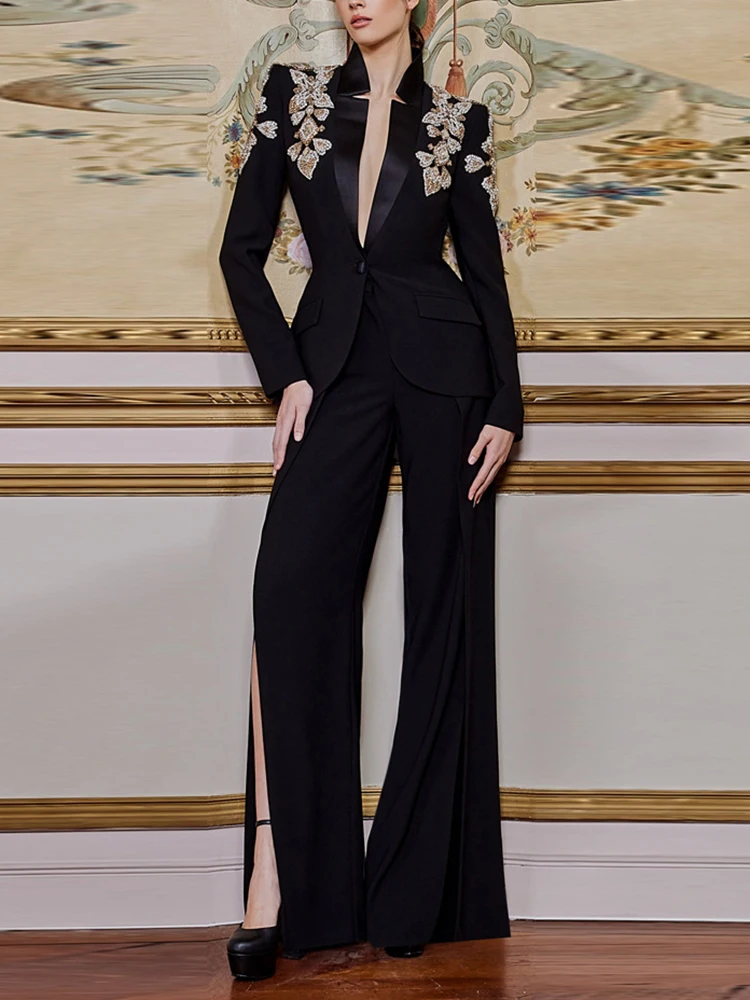 Destaca con este traje pantalón negro de mujer, una pieza icónica que redefine la elegancia contemporánea. El blazer estructurado con solapa satinada presenta un escote profundo en V y bordados dorados con pedrería en los hombros, aportando un toque de lujo y distinción.