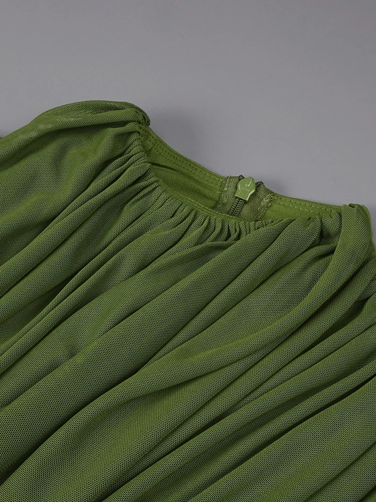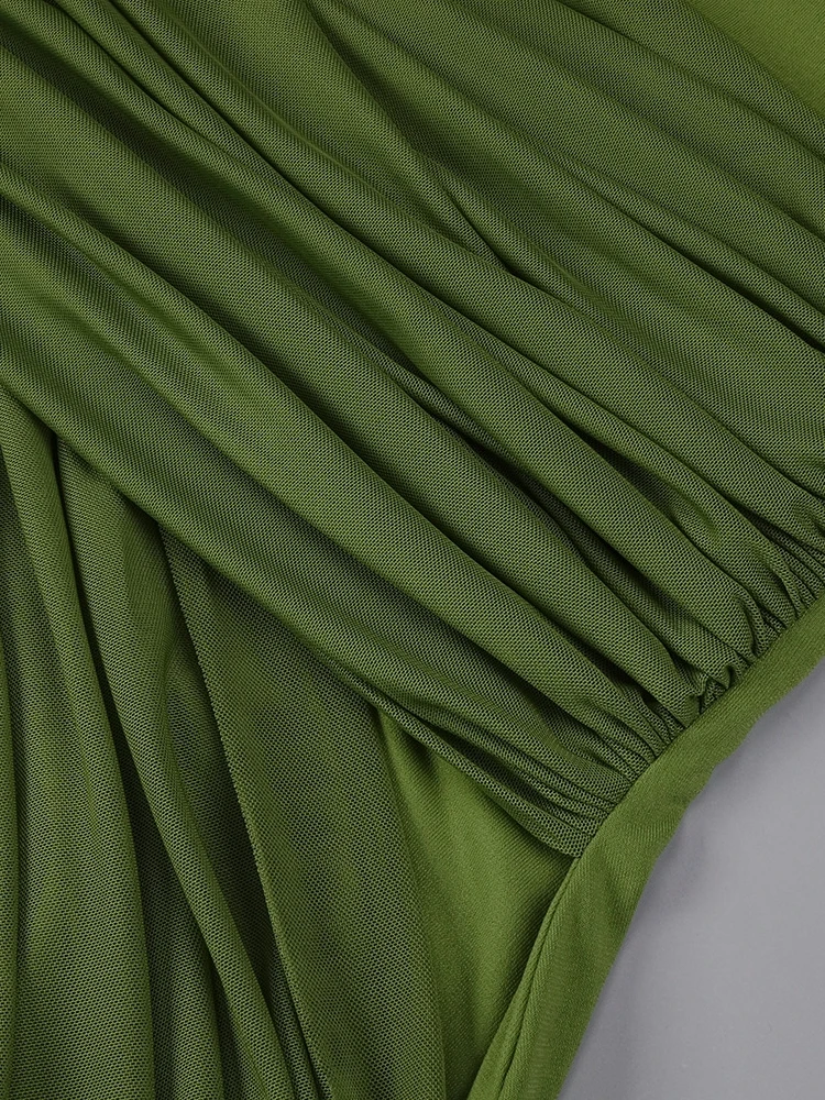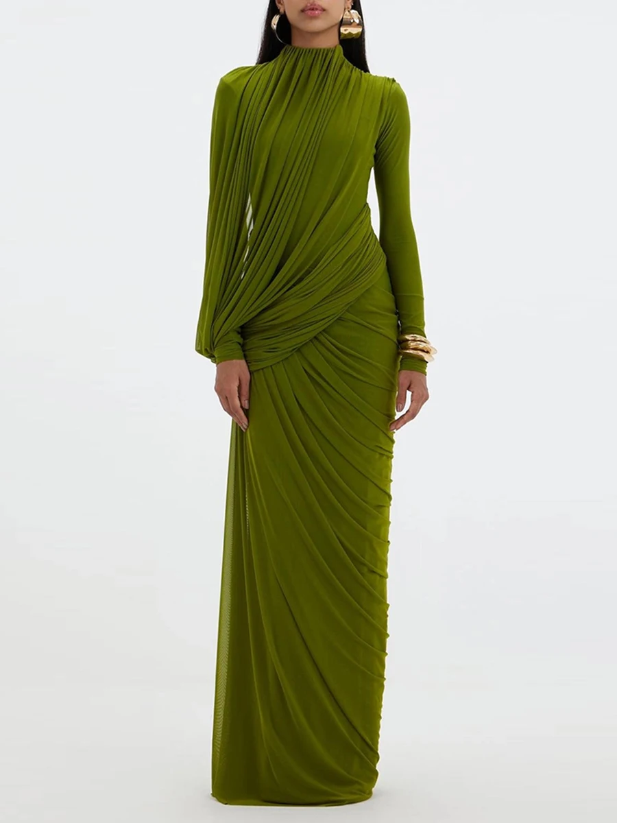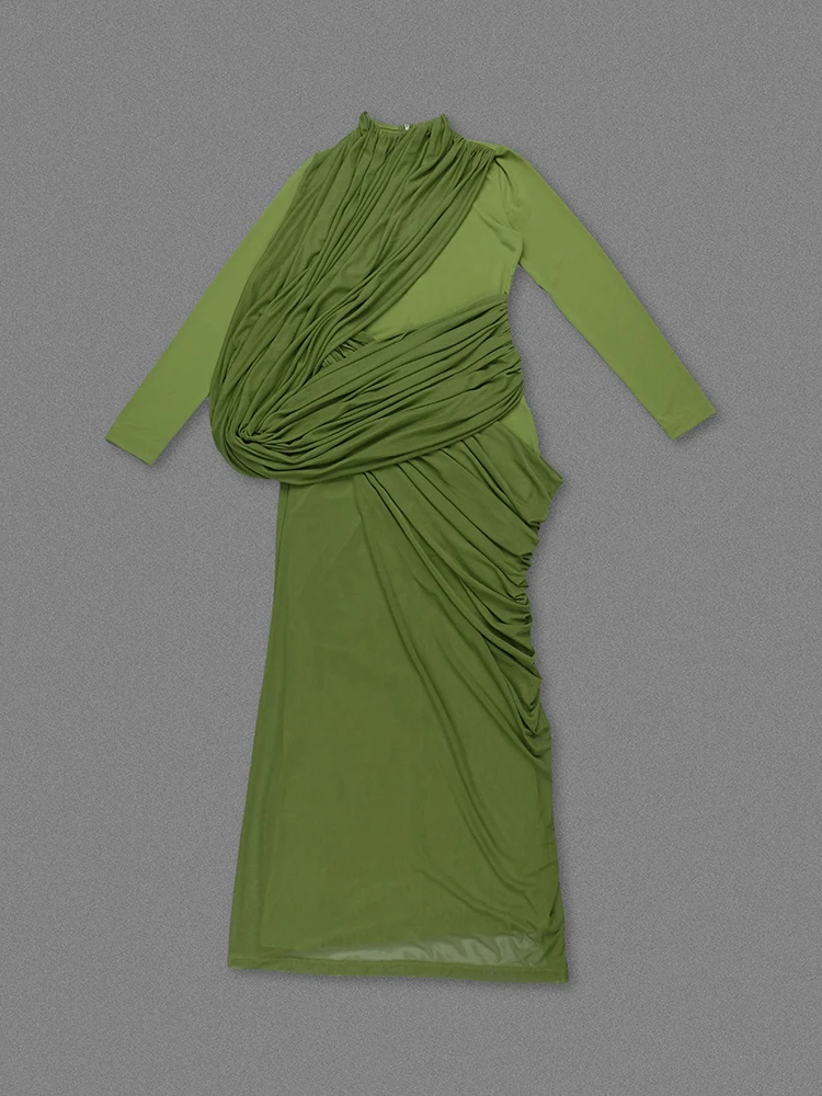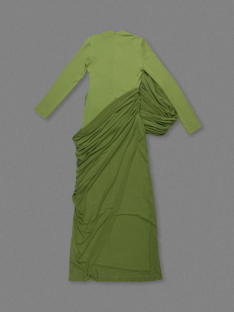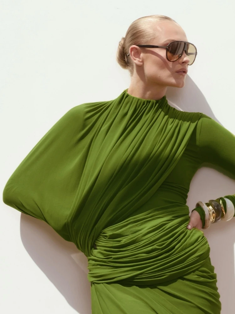Este vestido largo verde es una pieza de estética escultórica que combina elegancia contemporánea y feminidad sofisticada. Su diseño destaca por un drapeado envolvente trabajado de forma estratégica, que estiliza la figura y aporta un efecto visual favorecedor.