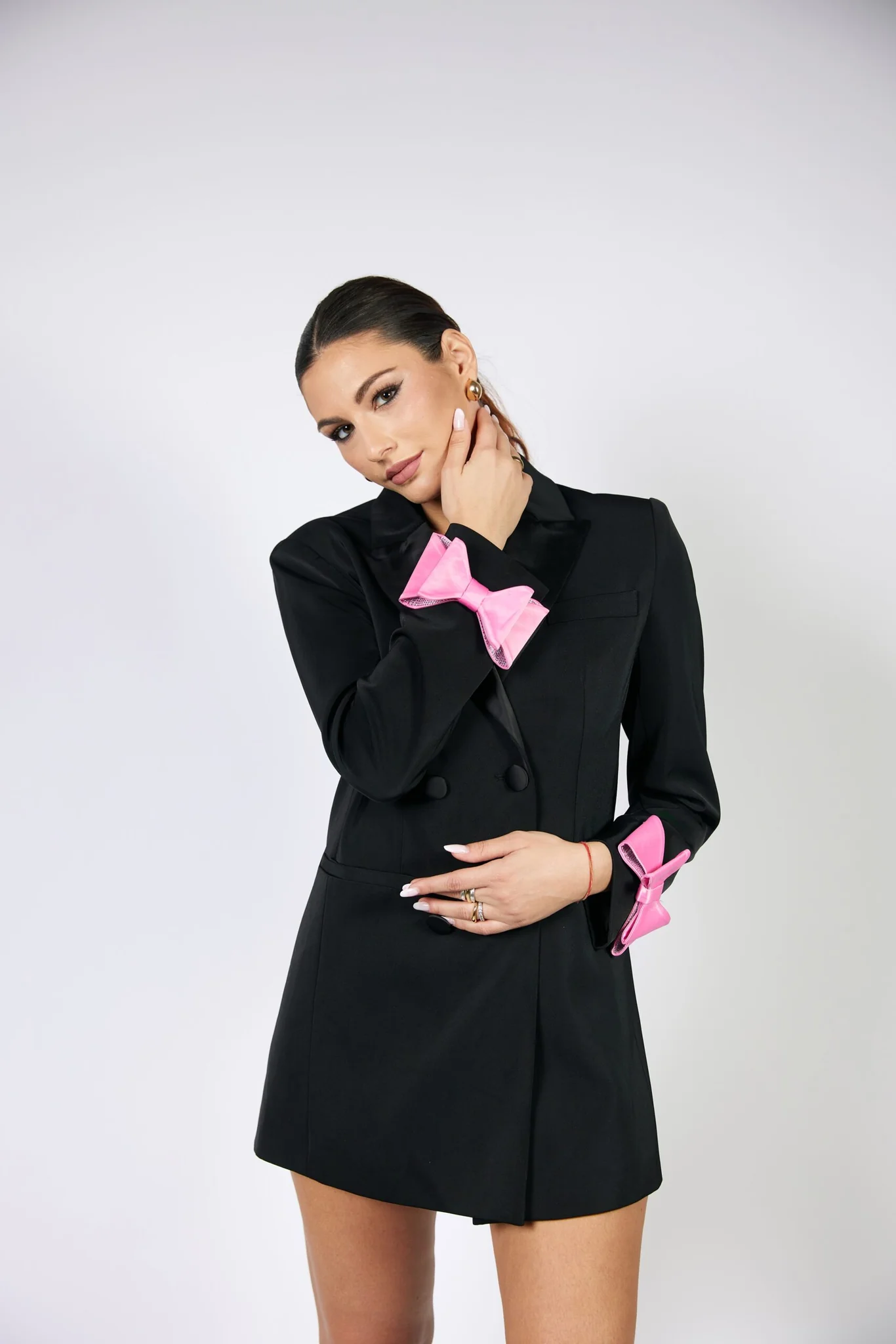El detalle protagonista son los lazos decorativos en color rosa de strass en los puños, que añaden un contraste delicado, femenino y original, convirtiendo este vestido blazer en una pieza única. Esta combinación de negro y rosa logra un equilibrio perfecto entre elegancia y modernidad.